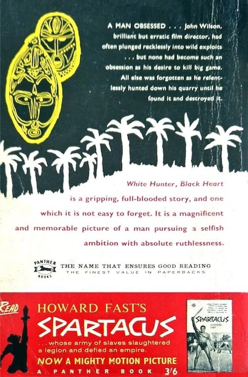 They don’t write ’em like this anymore. Peter Viertel’s White Hunter, Black Heart was originally published in 1953, with this Panther edition coming in 1960, fronted by uncredited cover art. The book is a tale of Hollywood filmmaking, African big game hunting, and personal conflict.