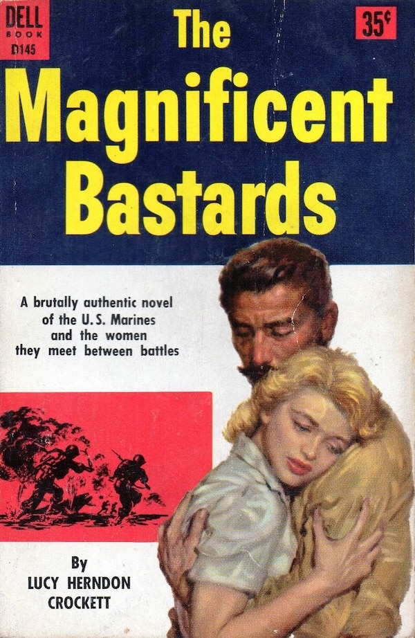 Above: a cover painted by Ray Pease for Lucy Herndon Crockett’s 1954 novel The Magnificent Bastards, a war drama set in New Caledonia, dealing largely with a war widow’s hook-up with a colonel who degrades and mistreats her. It was well reviewed. David Dempsey of the New York Times wrote: I know of no novel to come out of the war that so honestly illuminates the relationship between men in combat and the women who are sent out to bolster their morale. This is a tragedy for which Red Cross coffee and doughnuts are no balm. Miss Crockett has caught its essence with honesty and compassion. Crockett was a Red Cross veteran, so when it came to war and human relations she knew what she was writing about. War novels are the least enticing type of books out there for us, so we won’t be reading this, but it sounds interesting.