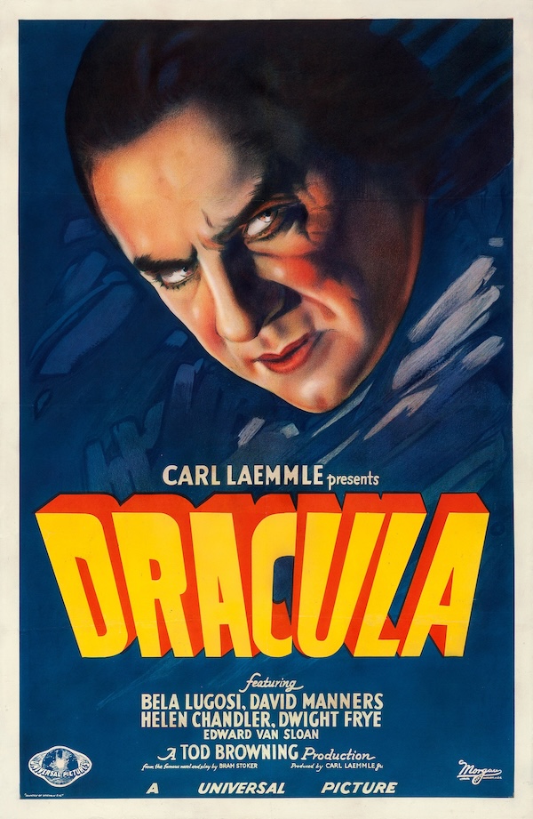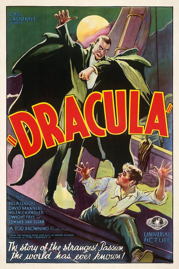 Above are three beautiful posters for the horror movie Dracula, which premiered today in 1931. They’re usually credited to Karoly Grosz, but all we know for sure is that he oversaw their creation. He was Universal Pictures’ advertising art director, helped produce at least seven posters to promote the film, and had final say over each. He could have painted these, but a subordinate also could have, or they could be collaborative. In the past we thought the middle poster was signed “GB” at its lower right, but now we aren’t sure. However they were produced they’re great, among the most memorable U.S. promos ever distributed.