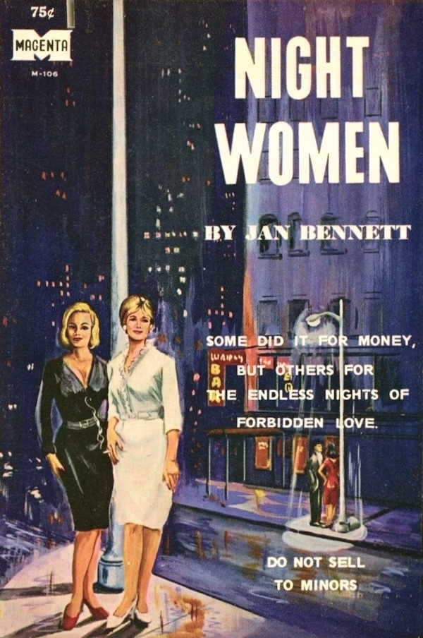 Prostitution was an obsession with mid-century publishers and moviemakers. We keyword for it on Pulp Intl., and if you click that link you’ll be directed to interminable diversion. This low-rent cover for Jan Bennett’s sleazer Night Women adds to the always growing subject. It came from Magenta Books in 1965, with art by an unknown. A few of our favorite prostie paperback covers are (yes, we’re going to link yet again to both Avenue of Pimps and Street of Ho’s) here, here, and here.