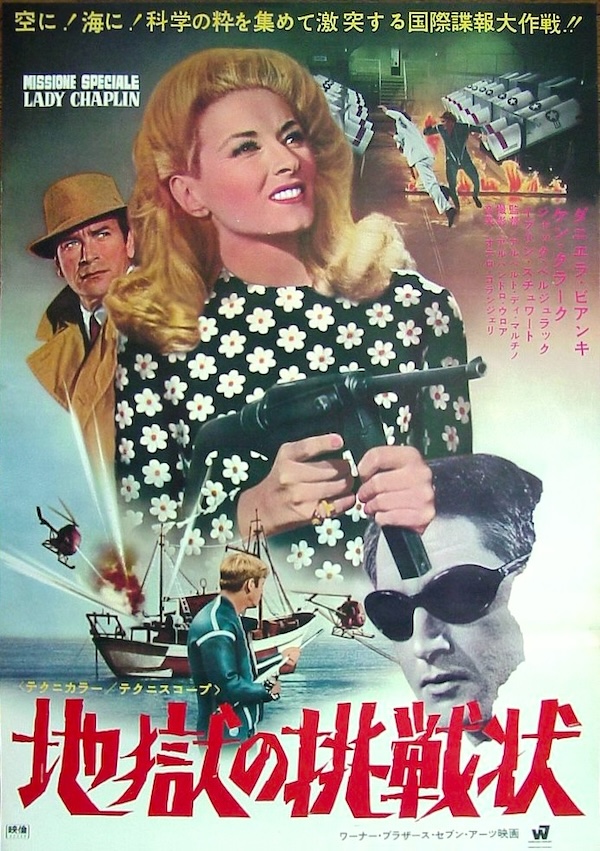 It’s winter in the south of Spain, which means rain, not cold (45°F is considered an ordeal here). But heavy precipitation is just as effective at keeping us indoors, and that means lots of movies—as you may have noticed. These two posters were made for the Japanese run of an Italian film called Mission speciale Lady Chaplin, and in English, Operation Lady Chaplin. This one surprised us. It’s low budget, but high budget within that tier. Which is to say that while it suffers from the same performance issues as other ’60s spy flicks that aren’t James Bond, it has nice exteriors shot in Madrid, London, Rome, and Paris, has reasonably convincing special effects, and even uses real helicopters. We learned after watching it that it’s the third and last of a series of films starring Ken Clark as secret agent 077. So with an audience baked in, it makes sense that real money was spent.