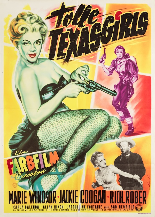 Tolle Texasgirls would translate as “great Texas girls,” but the movie that was promoted by this poster was originally made in the U.S. as Outlaw Women. The art here is by Heinz Bonné, and nice work it is. The film is a harmless popcorn muncher about an Old West town run by tough women and coveted by scheming men, worth a laugh if you’re of a certain mood. Which is to say it’s chauvinistic but good natured, like your kind but dumb uncle. You can read more here.