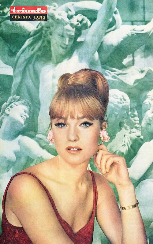 American actress Christa Lang is known for her many collaborations with director and husband Samuel Fuller, including The Naked Kiss, Shock Corridor, Underworld U.S.A., and his underrated racial drama White Dog. She also appeared in Jean-Luc Godard’s Alphaville, Peter Bogdanovich’s What’s Up Doc? and has already wrapped The Queen of Hollywood Blvd., to be released later this year. The above shot, showing her in front of a backdrop depicting Jean-Baptiste Carpeaux’s famous sculpture “La danse,” which is located on the façade of the Opera Garnier in Paris, appeared in the Spanish magazine Triunfo in 1965