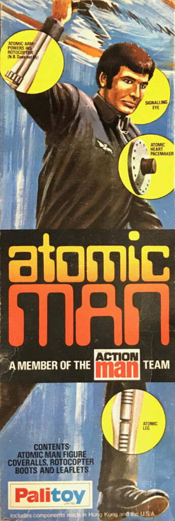 Power was also low rent in the sense that he never had a television show like the Six Million Dollar Man, but Hasbro put out a comic, and those are collector’s items today. There were actually two versions of Power. Here you see the British version, which was manufactured by Palitoy, and the main difference was Power’s plastic hair was replaced by a flocked hairdo that looked like a white guy ’fro. Below you see what Power is packing under his jumpsuit (“Daddy, why doesn’t he have a wiener?” “Well son, that’s because Atomic Man had it cut off when he became what’s called a eunuch. Bled like a pig, he did.”). You can see a couple more entries on vintage dolls here and here. And if you’re into futuristic toy ray guns, check here.
