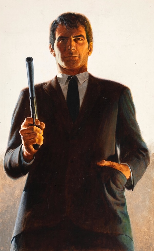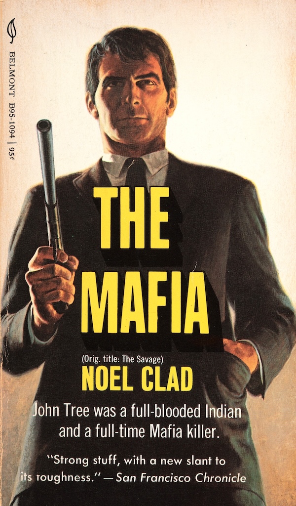 We shared the Harry Bennett cover for Noel Clad’s 1958 crime thriller The Savage. Above is Belmont Books’ 1970 pass at the novel, with uncredited art. This tale distinguishes itself by being an early effort to diversify old archetypes by making the central figure here—a Mafia hitman—a Shoshone Indian, with all that it entails. He’s a different kind of guy, and this was a decent if flawed book. More here.
