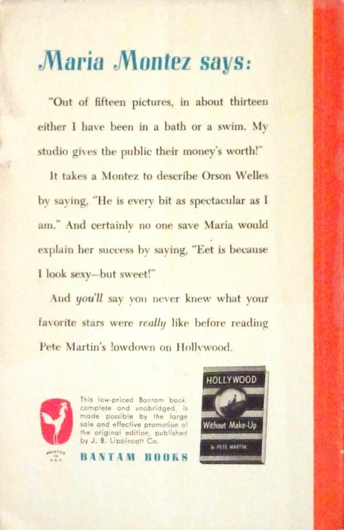 We have something a bit different today, a cover of Pete Martin’s tinseltown tell-all Hollywood without Makeup. What you get here are tabloid style bios of various cinematic luminaries, including Greer Garson, Ava Gardner, and Maria Montez. The info on the stars probably makes this one worthwhile by itself, but as a bonus you get tabloid style writing in long form. It’s a type of prose that isn’t practiced anymore, but it can be quite entertaining to read. Here’s an example: