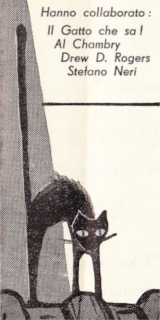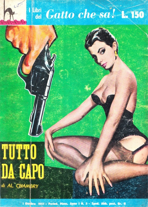 This uncredited cover for Al Chambry’s 1957 novel Tutto da capo was published by Edizioni Boselli as part of its I Libri del Gatto che sa! collection. That means, “the books of the cat that knows.” All we know is that this is one cool cat logo.