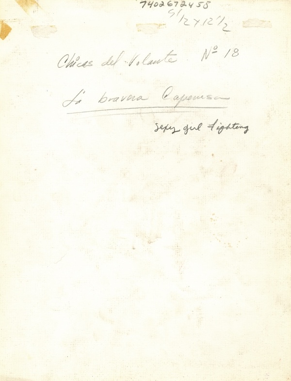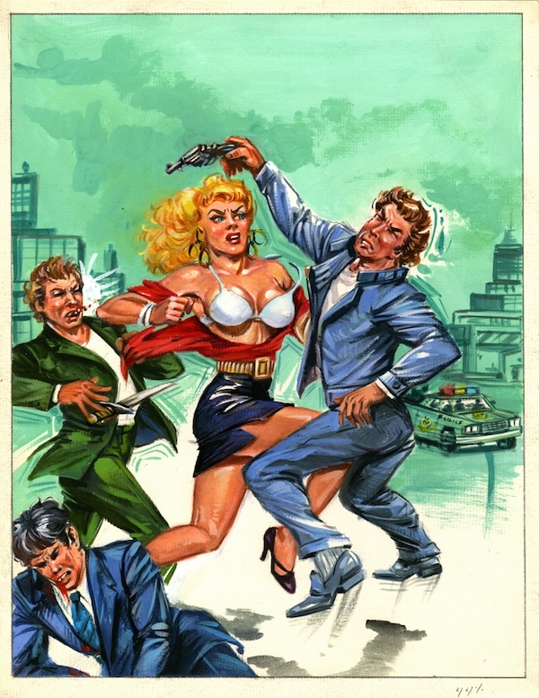 We still have some pieces of Mexican comic book art, so we’re back to that stack of pasteboards today. This one was made for the Editorial La Foca series Chicas del volante, number eighteen in the run, a 1993 installment titled La bravura campesina. If you use an online translator it’ll probably tell you a campesina is a peasant. That’s correct, but as Spanish speakers “peasant” isn’t the connotation we personally get from the word. To us, it means a woman who lives in the country and probably works on a farm. Is that a peasant? Maybe so. This woman looks more urban, but either way, she knows how to use her sharp corners, as one assailant is catching an elbow to the chops while the other’s gonads are being driven into his abdominal cavity by her knee. What a bizarre and violent piece, but then they all are. That why we share them. See here and here, for examples. The verso of these often strike us artful too, due to discoloration and notations, so we’ve added that below. There’s no signature front or back, so the artist here is unknown.