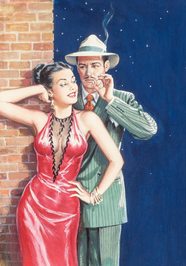 Above: the uncredited front cover, plus the rear cover, of the very first issue of Ecstasy Novel Magazine, November 1949, with Trudy Hamilton’s A Body To Own inside. We added the rear just to show how digest novels self-promoted their output. Readers typically bought their first in a bus station or drugstore, but thereafter were prodded to buy by mail, discreetly, to get their rocks off. Not that these novels were in any way pornographic. But they did get racy at times, depicting women who definitely weren’t waiting for marriage before hitting the sheets. Often, the heroines even bedded two or three men. There was hardcore literary porn around, but it was harder to find and as a rule terribly written. Digest publishers employed competent authors, though they would never be mistaken for masters of the craft. Some, though, such as Jed Anthony, N.R. De Mexico, and Val Munroe, wrote good books. We have plenty of digests sitting around, so you’ll continue encountering them on our site. You can see a couple more examples from Ecstasy Novel Magazine here, here, and here.