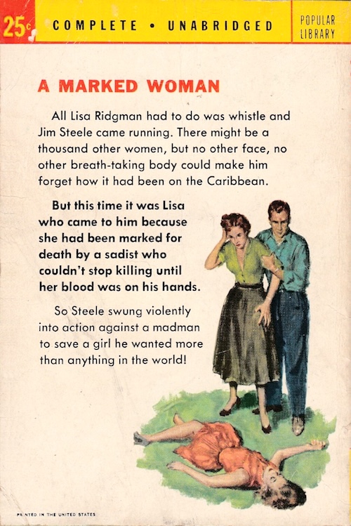 She summons help to her enclave in the Connecticut countryside in the form of a rugged pilot and former lover with the unlikely name Jim Steele. He’s reluctant to get involved because Lisa jilted him after a Caribbean idyll and married a wealthy psychiatrist. But he can’t resist—and really, how can he when asked by “a long-legged, slim-hipped Diana with—startlingly and unforgettably—the breasts of Venus.”?