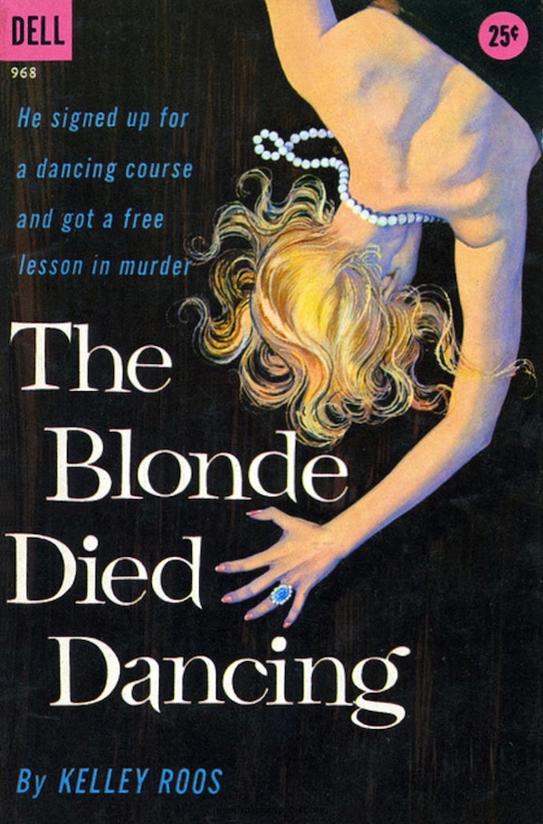 Above: a simple but effective Victor Kalin cover for The Blonde Died Dancing by Kelley Roos, along with the flipside, originally 1949, with this Dell version coming in 1958. The book is about devoted wife Connie Barton, whose husband Steve becomes the main suspect in the murder of a dance teacher. Connie goes to the dance school, applies for and obtains the vacant teacher position, and proceeds to sift through the students, seeking to exonerate her husband, who’s become a fugitive from police. As usual with husband/wife narratives from the period, this one is lightweight, pleasant, riff-filled, and a quick read, made all the more interesting once you know Roos was a pseudonym used by real-life spouses Audrey and William Roos. In fiction, pleasantness is often enough.