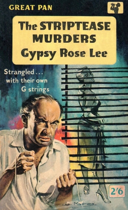 We said we’d buy Gypsy Rose Lee’s second mystery novel Mother Finds a Body, but we haven’t yet, so instead we’re sharing an alternate cover for her first. Originally published in 1941 by Simon & Schuster as The G-String Murders, we showed you a Pocket Books edition from 1947. The above edition came from Great Pan in 1959, retitled The Striptease Murders. We love it. You got your noir blinds, your femme fatale, great colors, and—oh right—a schvitzing psycho. The art is signed De Marco, a person who in real life was Gerald Facey. We’ve seen a few other pieces from him, so we’ll try to circle back later.