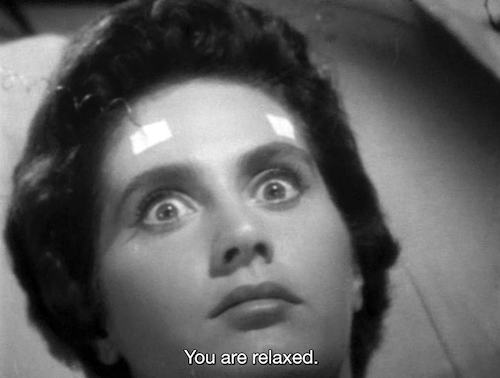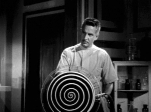 Okay, you’re back. In this fascinating film a criminal known as El Murcielago, or the Bat, conducts illegal research in body part transplantation. Let’s set him aside for a few seconds. Elsewhere, another doctor, played by Ramón Gay, is performing research into past life regression, but rank and file scientists doubt his conclusions, and he can’t prove them unless he has a willing subject to undergo hypnosis. As luck would have it, his girlfriend Rosita Arenas wants to lend a psyche. Seriously, a girlfriend who puts her mind completely in her man’s hands? Marry her.