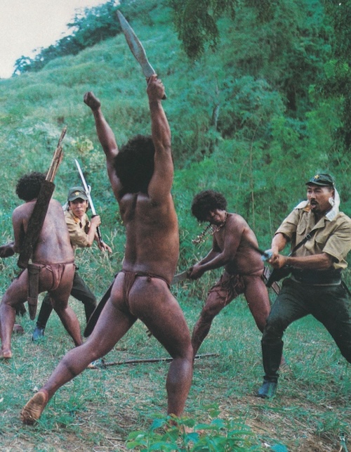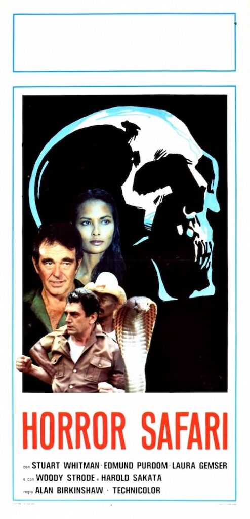 In a prologue segment, a Japanese platoon carrying twelve cases of gold through the Philippine jungle at the end of World War II is attacked by tribesmen. They’re decimated, but the three survivors hide the cases. Thirty-six years later a hard-bitten fortune hunter catches wind of a treasure map, and procures it through violent means. He assembles an expedition peopled by the likes of Stuart Whitman, Glynis Barber, Woody Strode, and about ten others. The producers might as well have put that last group in t-shirts with the words “body count” stenciled across the front, because the horror part of the safari has to do with the fact that the tribe from earlier is cannibalistic.