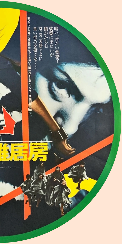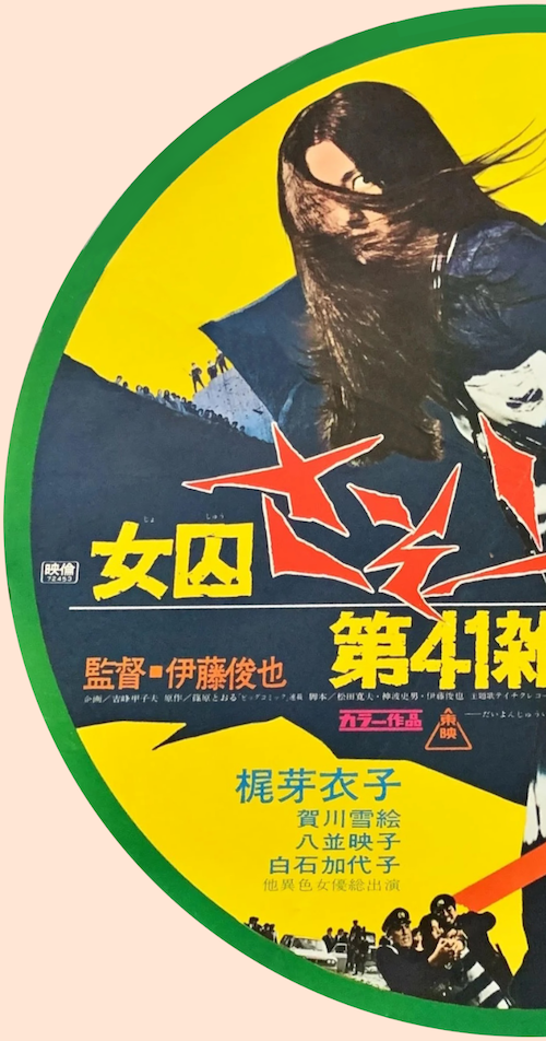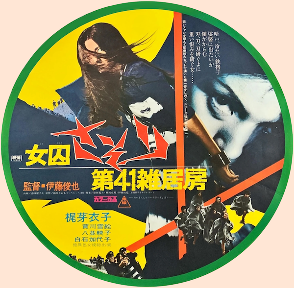 We’re in Japan again today with another Meiko Kaji poster. Above you see an incredibly rare circular promo for the pinku film Joshû sasori: Dai-41 zakkyo-bô, aka Female Prisoner Scorpion: Jailhouse 41, along with the scan in halves so you can see its details. It premiered in Japan today in 1972. Meiko’s paid her debt to society for now, so we’ll let her go, but don’t worry. She’s a career criminal—she’ll be back.