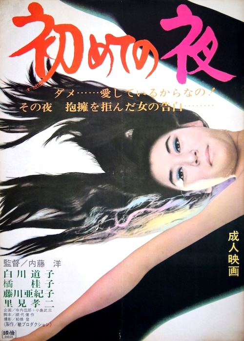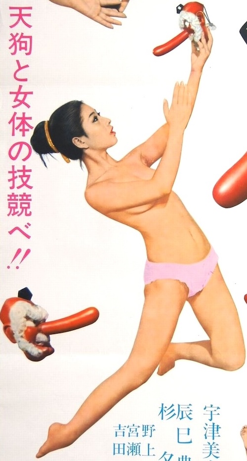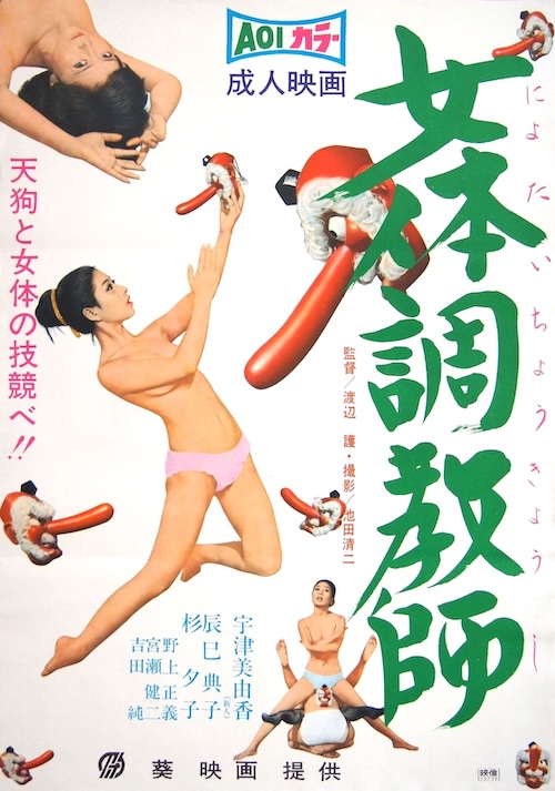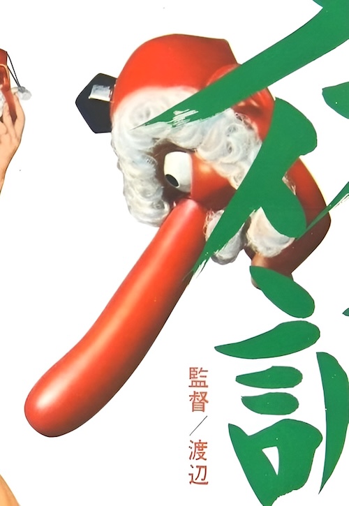 We have many more Japanese movie posters than films associated with them we can locate to watch. Today we’re sharing three promos for films we haven’t seen and probably never will. Why these, of all those we have? Because we think they have holiday colors, and one—definitely holiday related—even has phallus-nosed Santas on it, as you see just above and below. The first is for 1972’s Chikan 365, starring Michiyo Mako, the second is for 1965’s Hajimete no yoru, starring Michiko Shirakawa and Keiko Tachibana, and the third is for 1970’s Nyotai chôkyôshi, with Yuka Utsumi. None of these had western releases, so there are no English titles for them, but they’d translate as something like “molester 365,” “first night,” and “female fitness teacher.” None are from kinky Nikkatsu Studios, surprisingly. They’re very interesting, don’t you think? We’ll try to do more of this in the future.