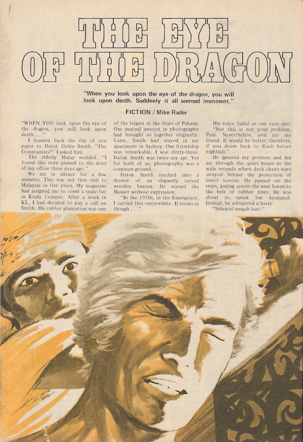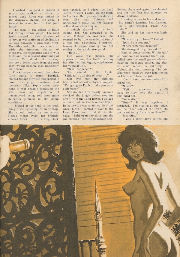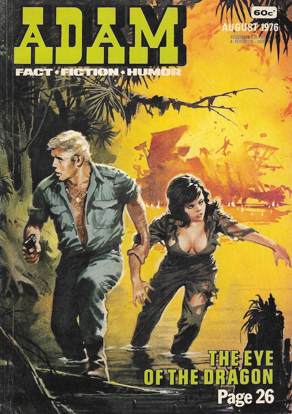 Above is the cover of the August 1976 issue of the Australian men’s adventure magazine Adam, a publication we’ve featured a few times* in the past. The front illustration is an unusually colorful and evocative piece for a magazine that specialized in them. It pairs with a story by stalwart Adam contributor Mike Rader titled “The Eye of the Dragon,” which is about a magazine writer in Malaysia, the beautiful spy he encounters, and a legendary gem coveted by all and sundry. As always, Rader does pretty good work.