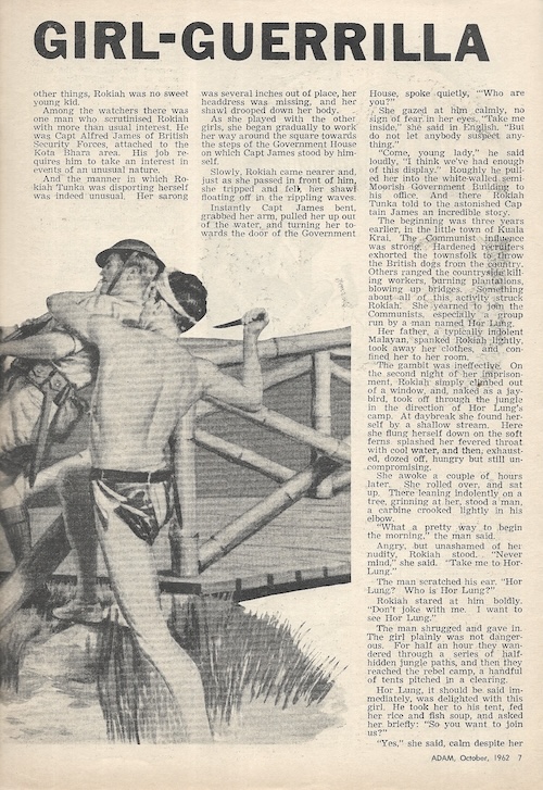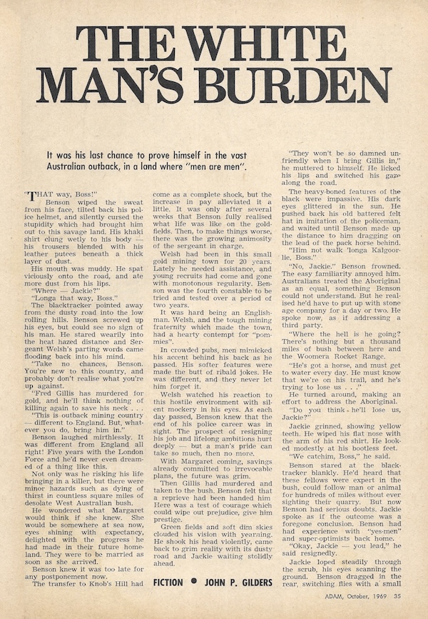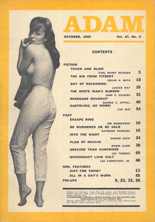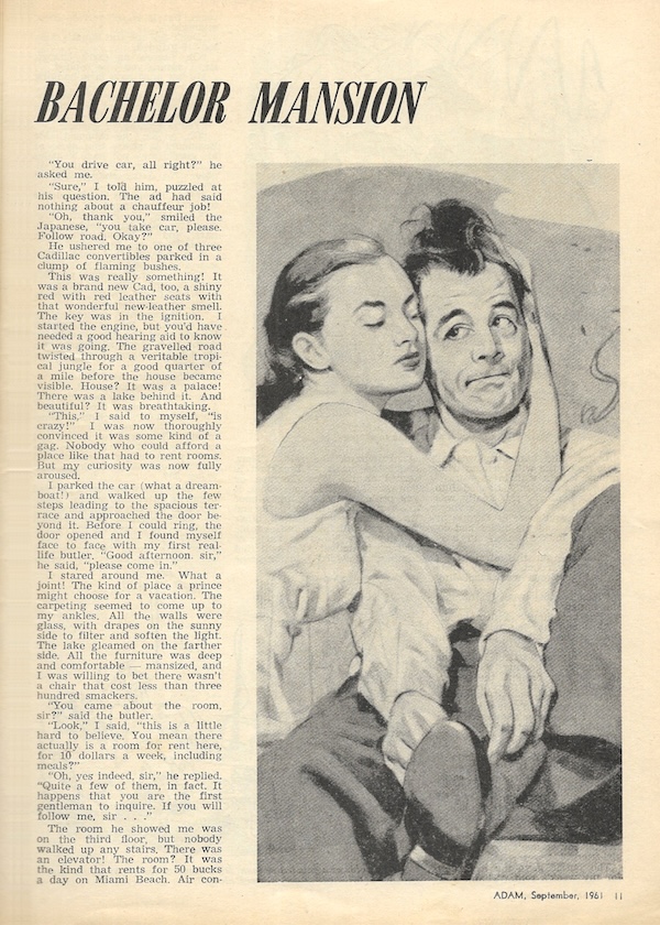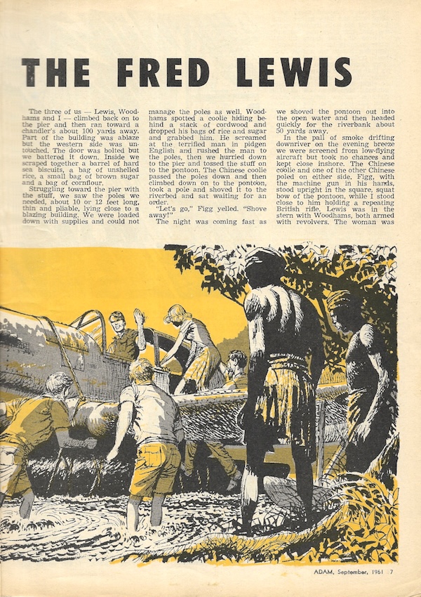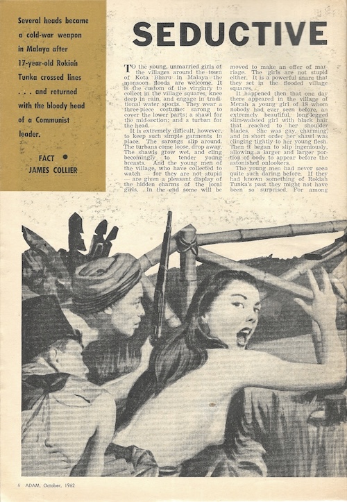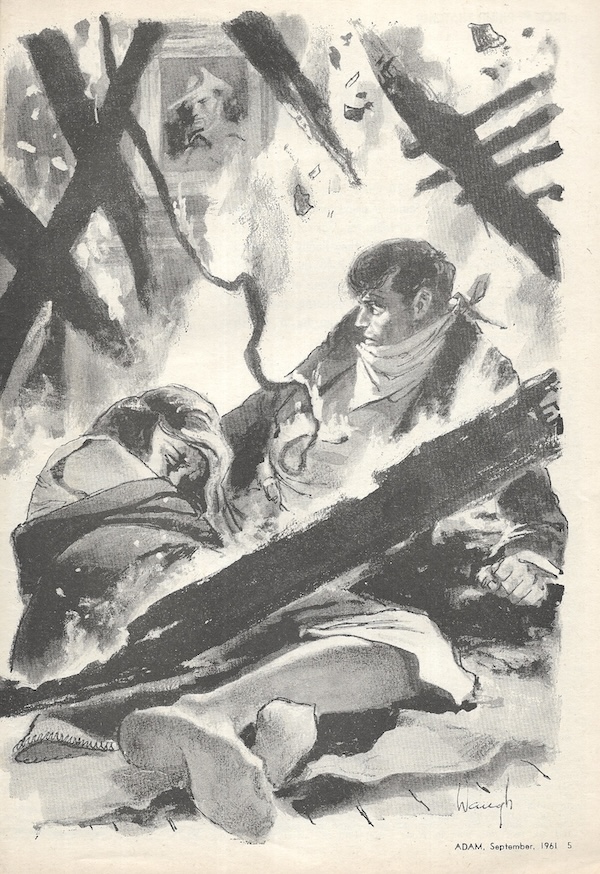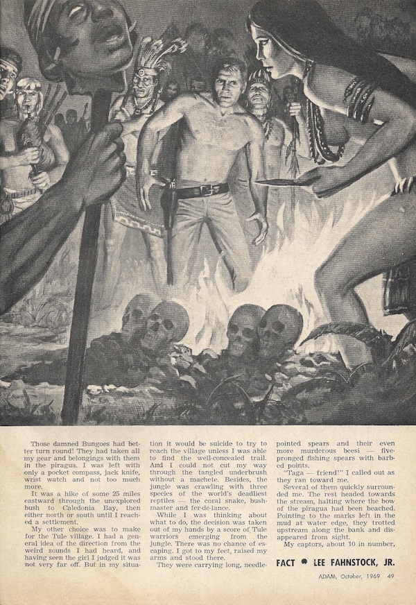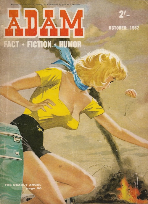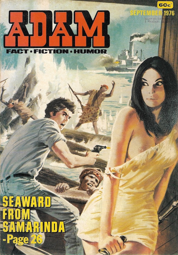 As we paged through this Adam we found numerous fascinating features, such as the factual stories “Witchcraft Love Cult,” about a man captured by Panamanian Indians, and “Be Murdered or Sold,” about a woman trafficked into sexual bondage in Yemen. There’s also fiction from veteran Adam contributor John P. Gilders called “The White Man’s Burden.” That term, for those who don’t know, refers to the idea that white men were morally obligated to “civilize” inhabitants of the lands they colonized. The story completes an unusually interesting set of literary contributions in a magazine that never fails to entertain.