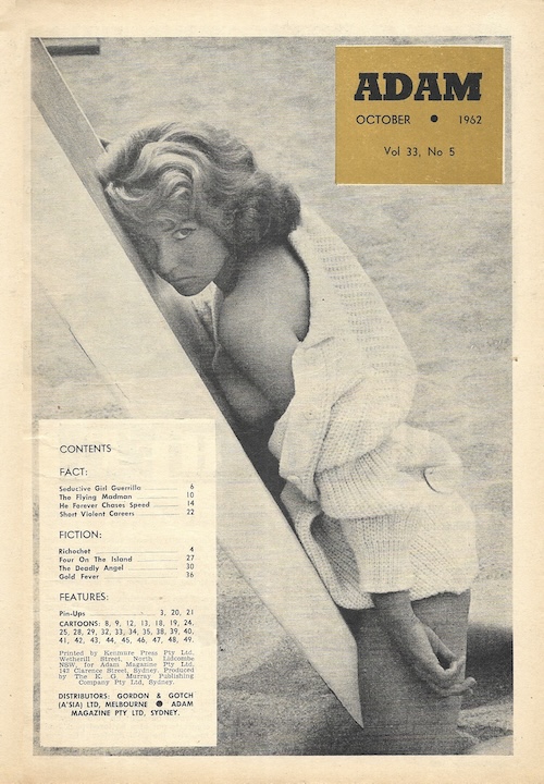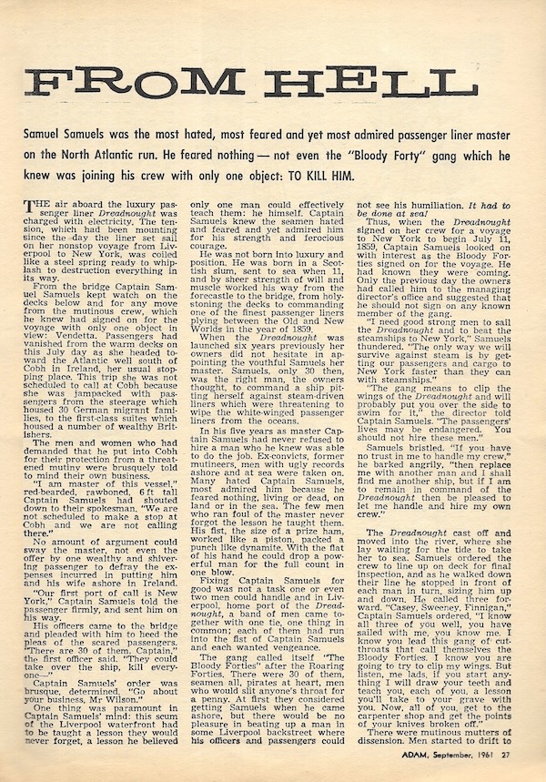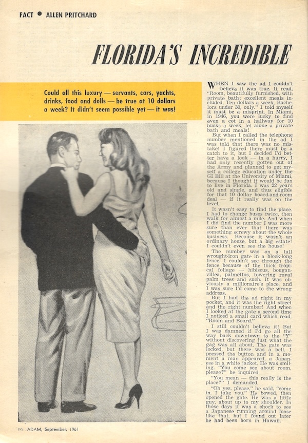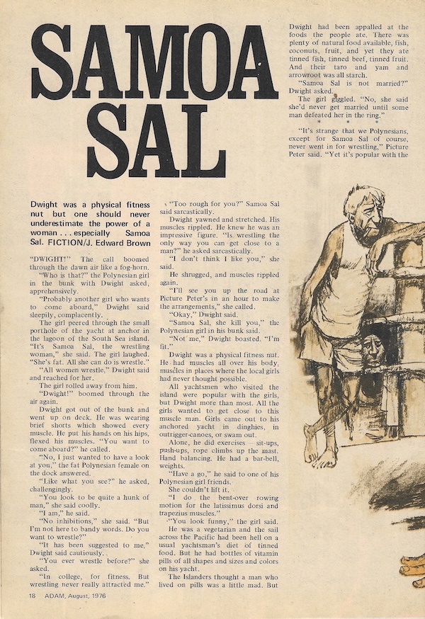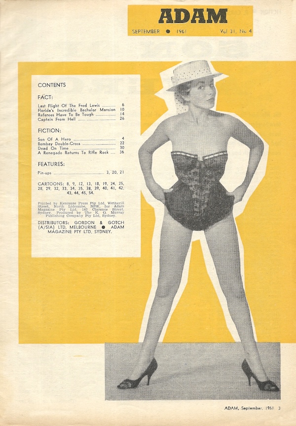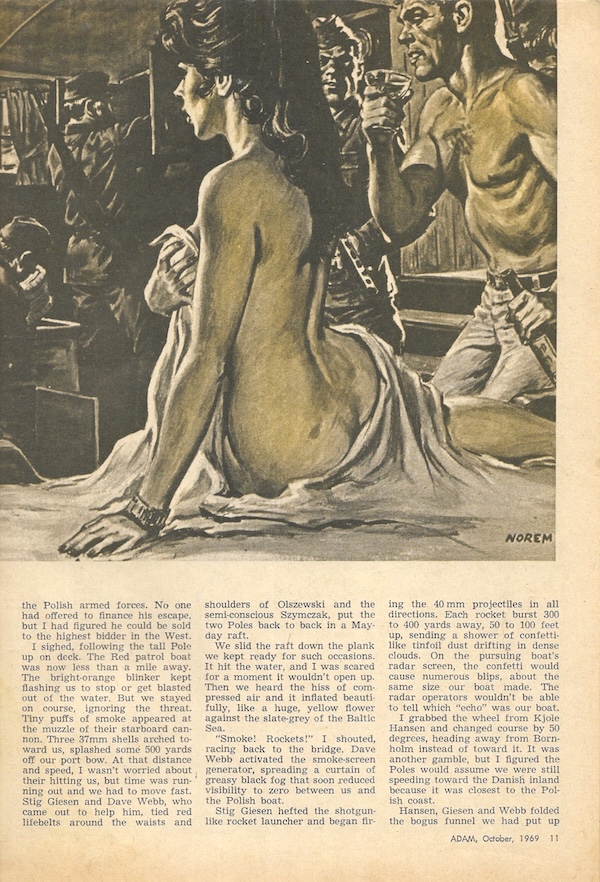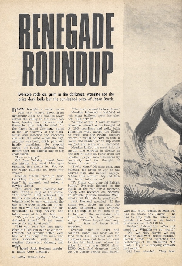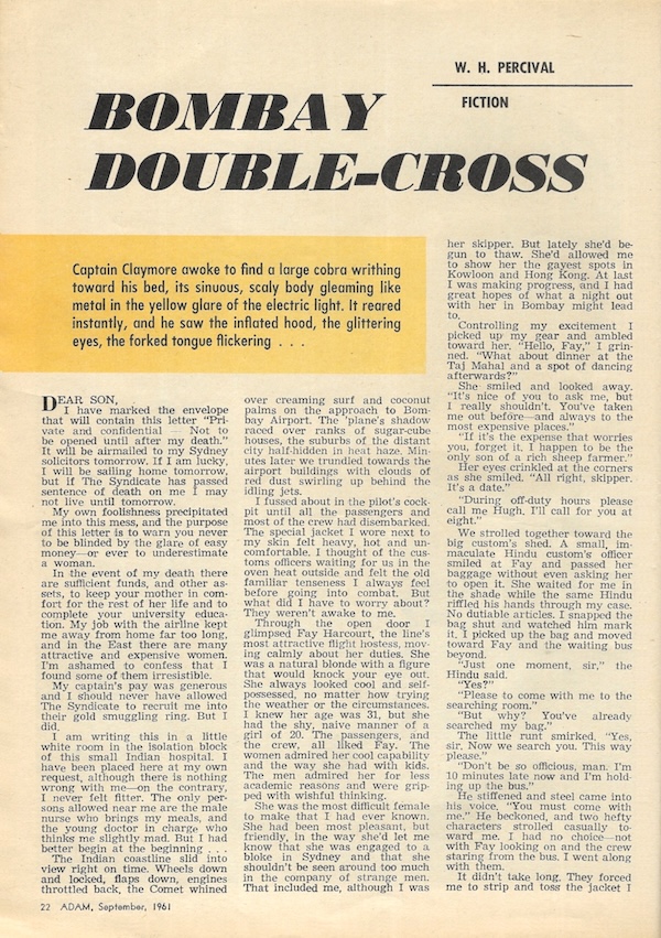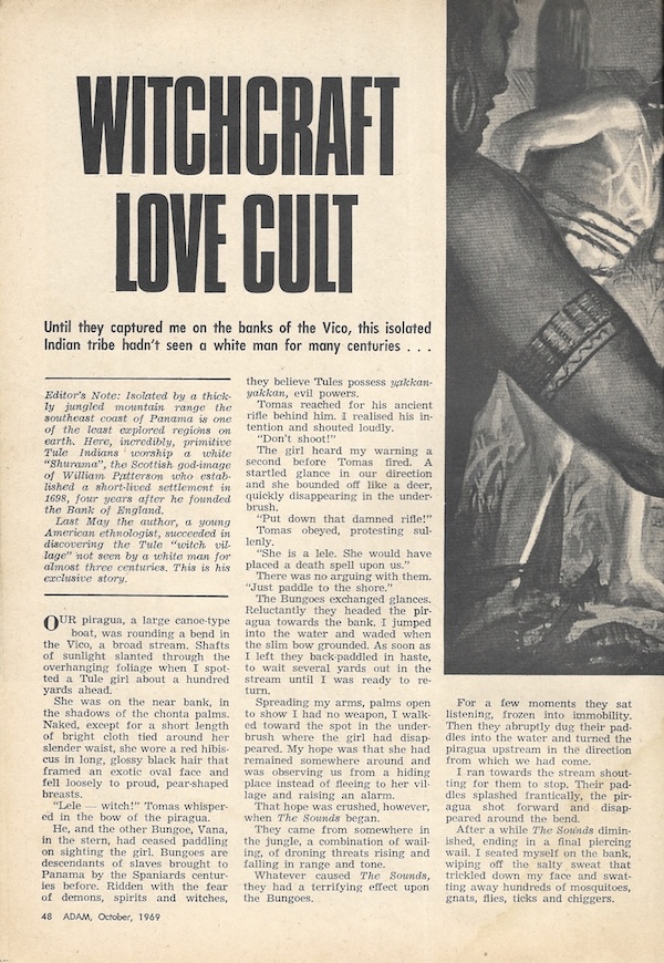 As we paged through this Adam we found numerous fascinating features, such as the factual stories “Witchcraft Love Cult,” about a man captured by Panamanian Indians, and “Be Murdered or Sold,” about a woman trafficked into sexual bondage in Yemen. There’s also fiction from veteran Adam contributor John P. Gilders called “The White Man’s Burden.” That term, for those who don’t know, refers to the idea that white men were morally obligated to “civilize” inhabitants of the lands they colonized. The story completes an unusually interesting set of literary contributions in a magazine that never fails to entertain.