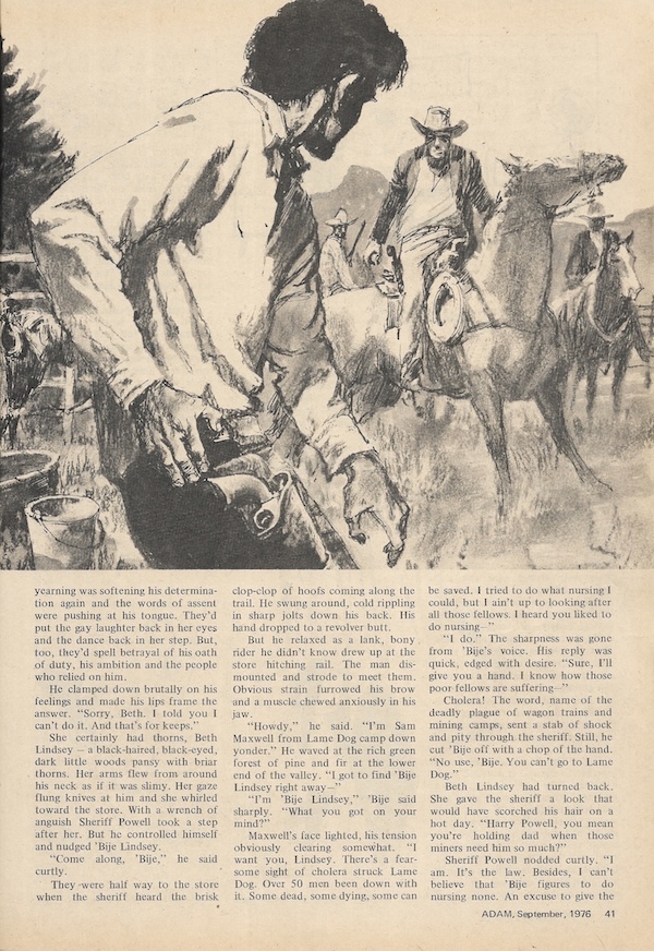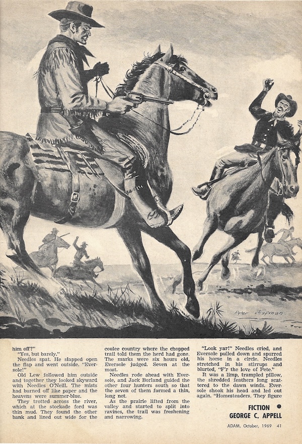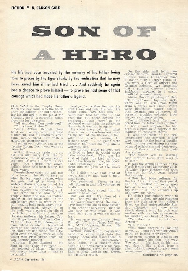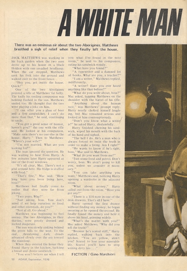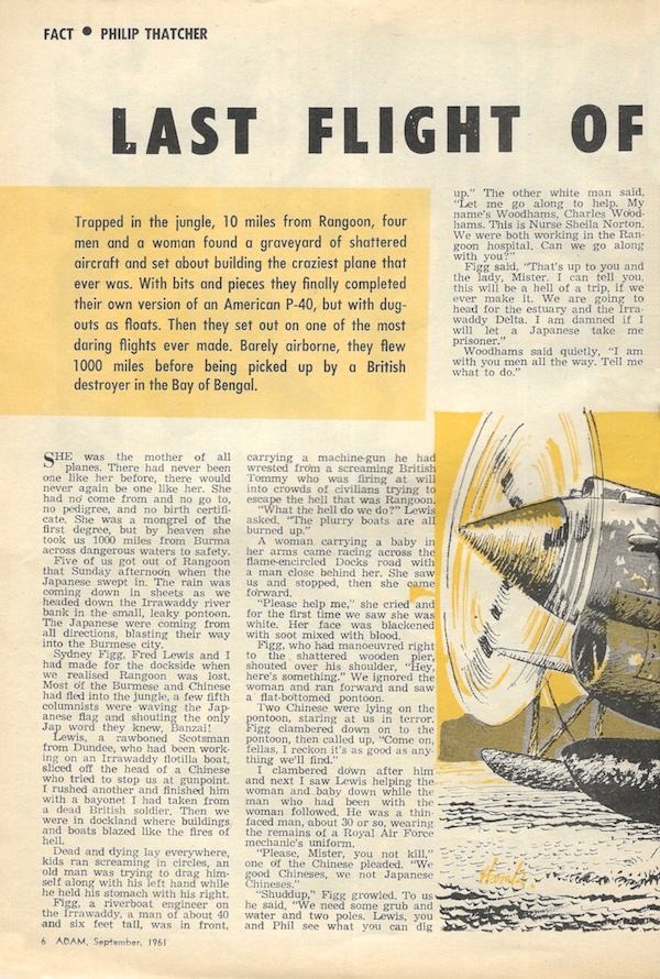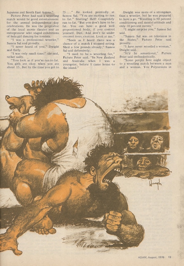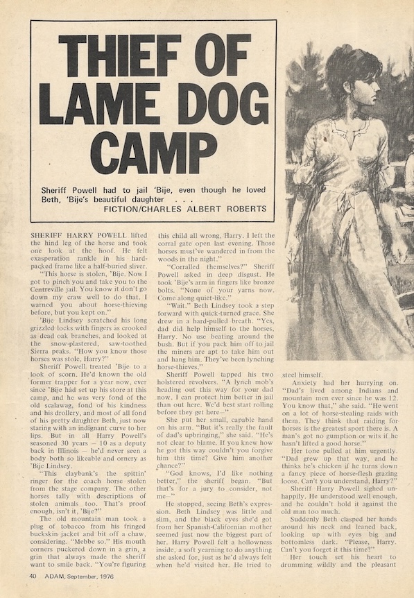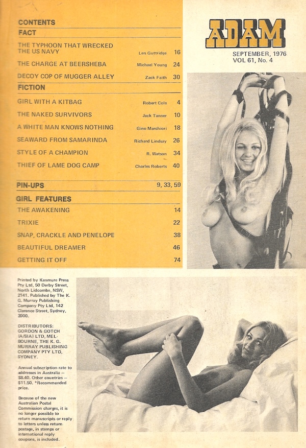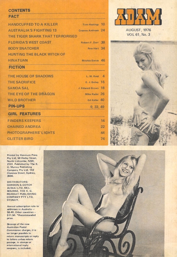 As we paged through this Adam we found numerous fascinating features, such as the factual stories “Witchcraft Love Cult,” about a man captured by Panamanian Indians, and “Be Murdered or Sold,” about a woman trafficked into sexual bondage in Yemen. There’s also fiction from veteran Adam contributor John P. Gilders called “The White Man’s Burden.” That term, for those who don’t know, refers to the idea that white men were morally obligated to “civilize” inhabitants of the lands they colonized. The story completes an unusually interesting set of literary contributions in a magazine that never fails to entertain.