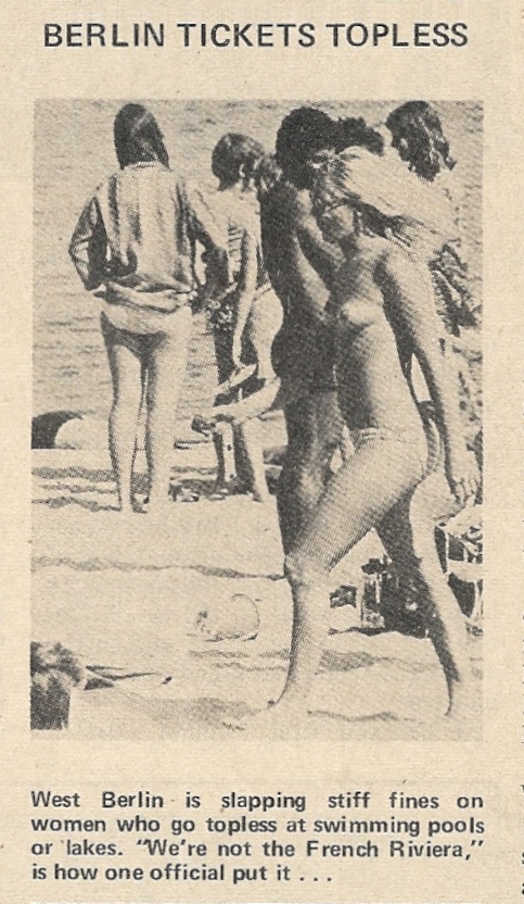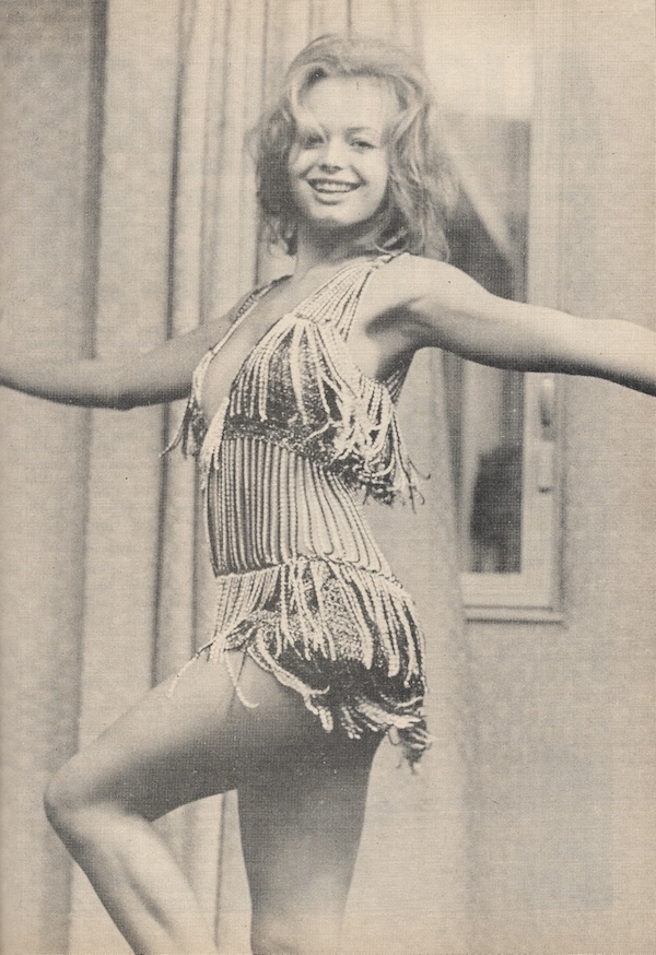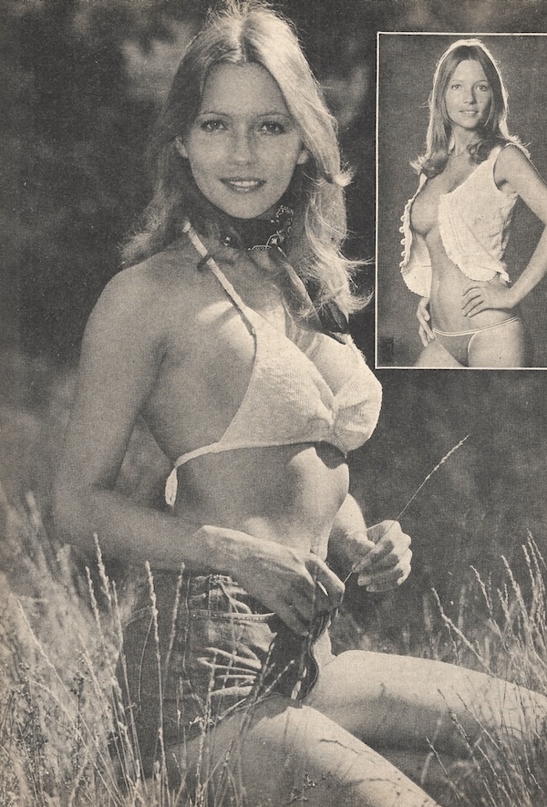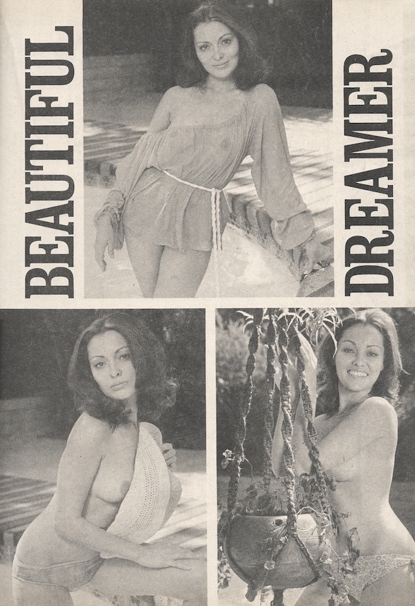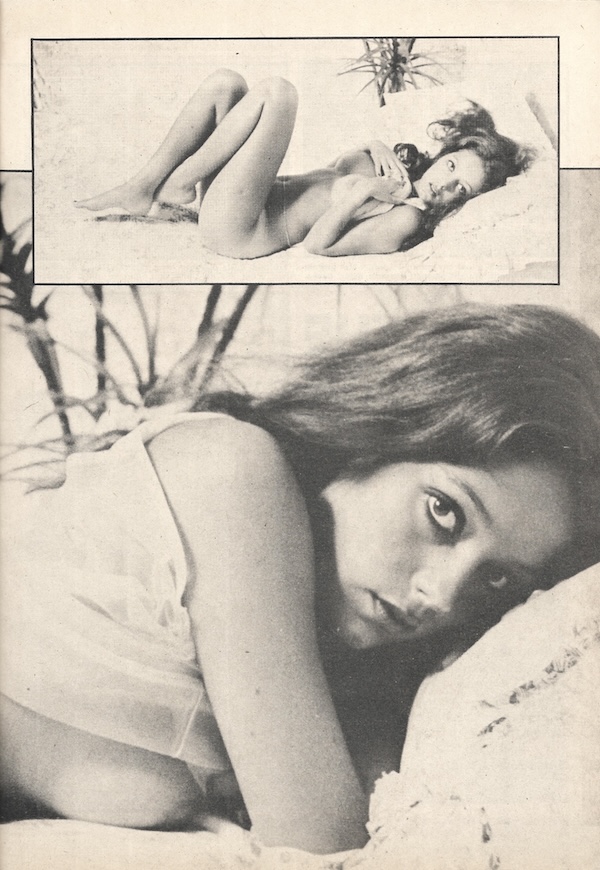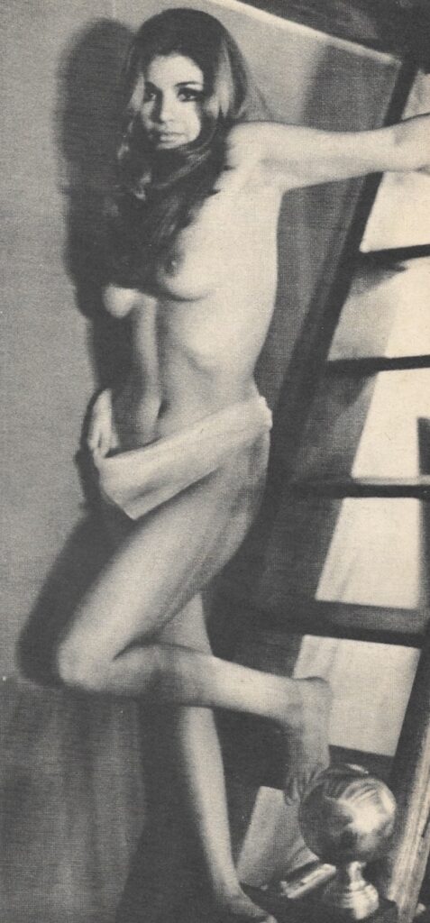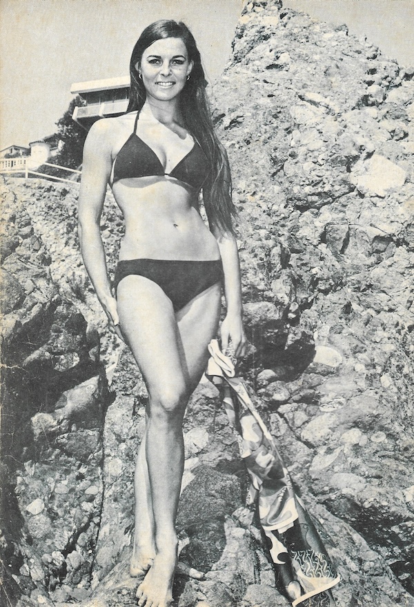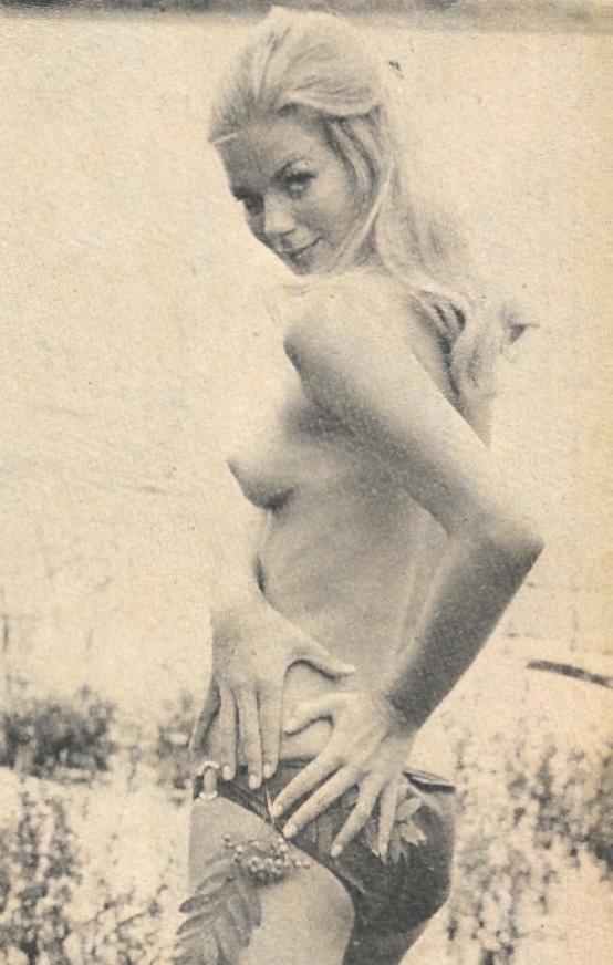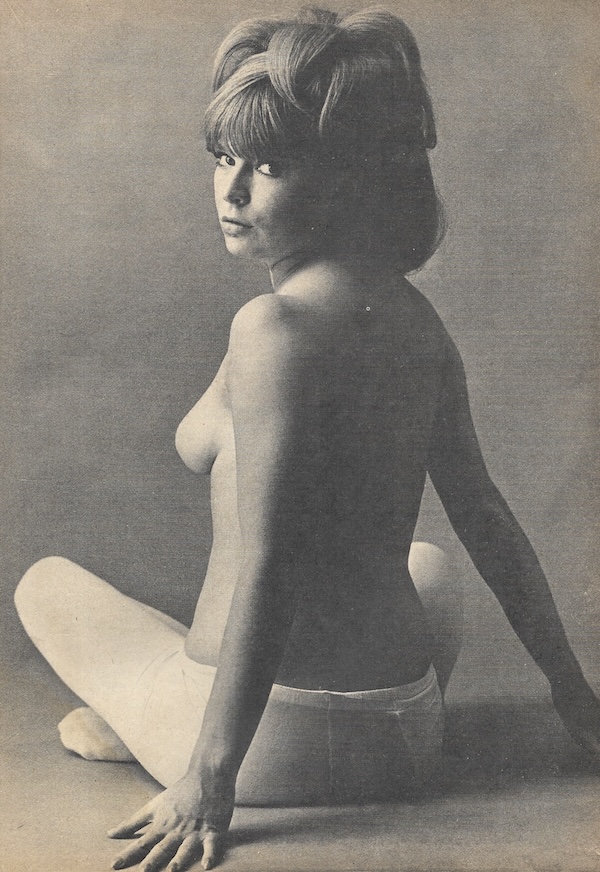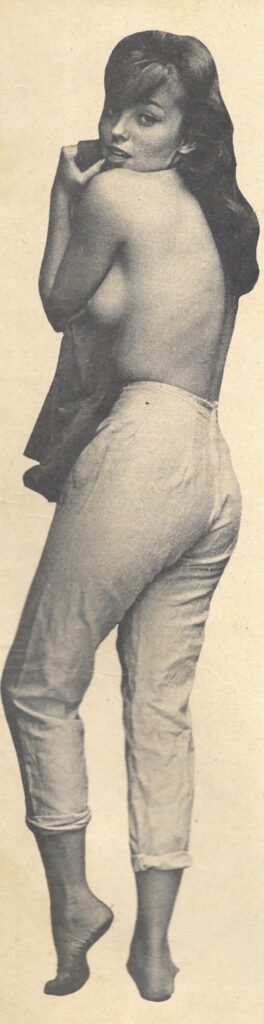 In addition, on the inside of the front cover is U.S. model, actress, and photographer Salli Sachse, who appeared in such films as The Million Eyes of Sumuru and The Ghost in the Invisible Bikini. She died just last month. Several other beautiful models grace the interior pages, none of whom we can currently identify. Maybe we’ll get a bit of reader help on them.