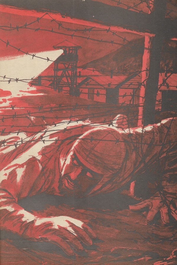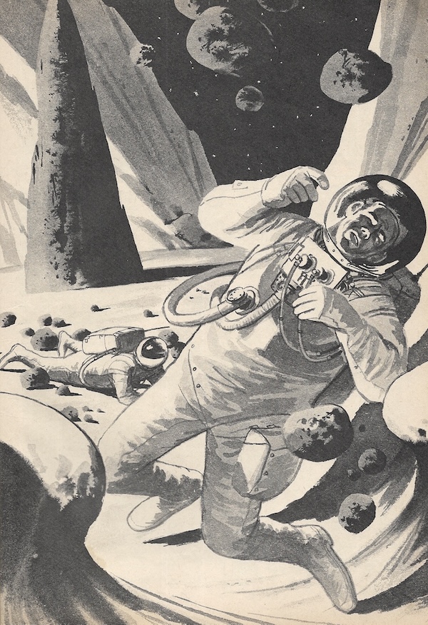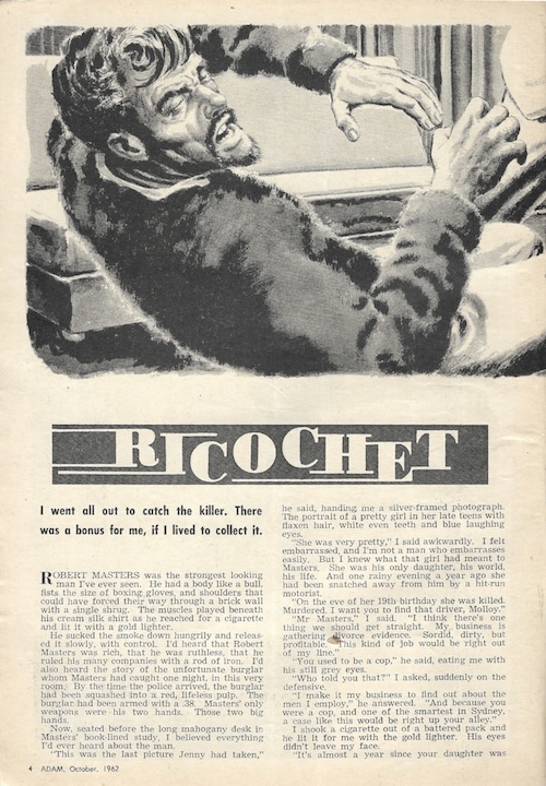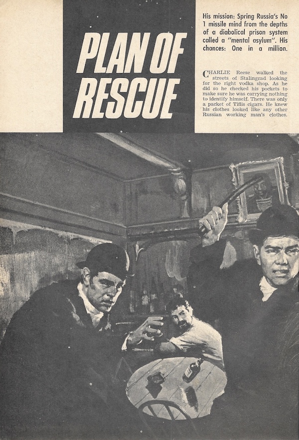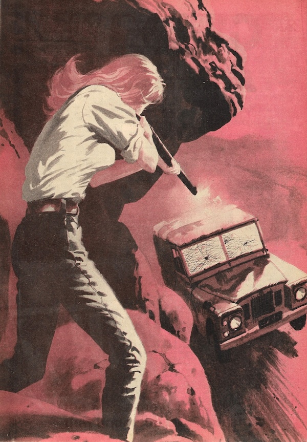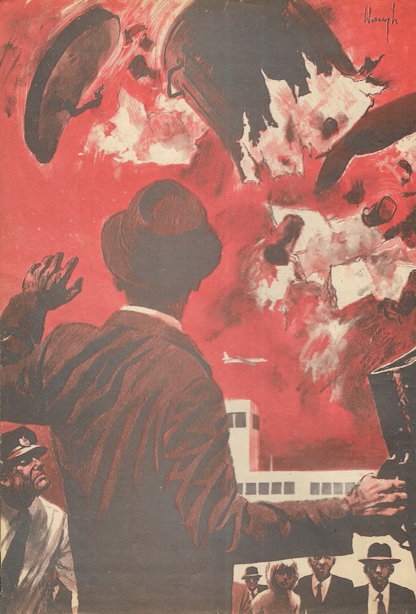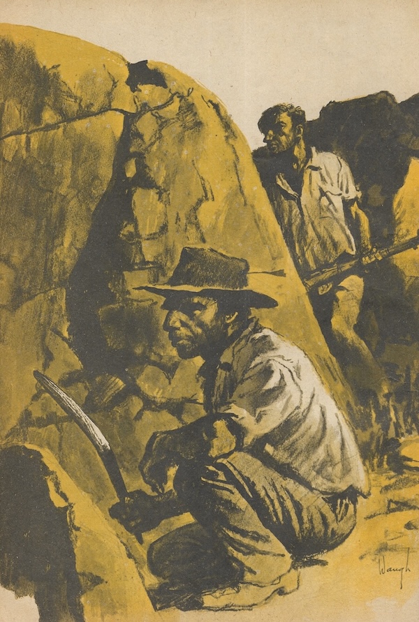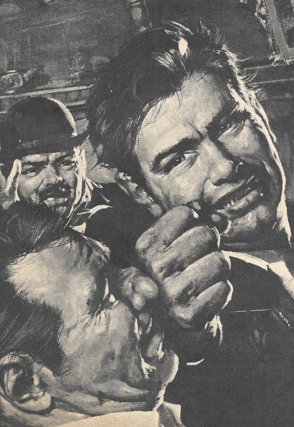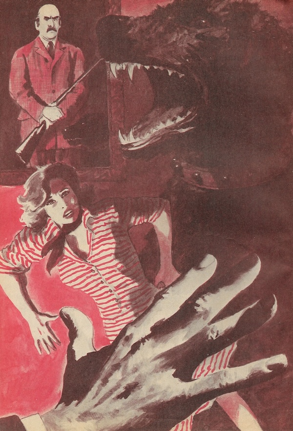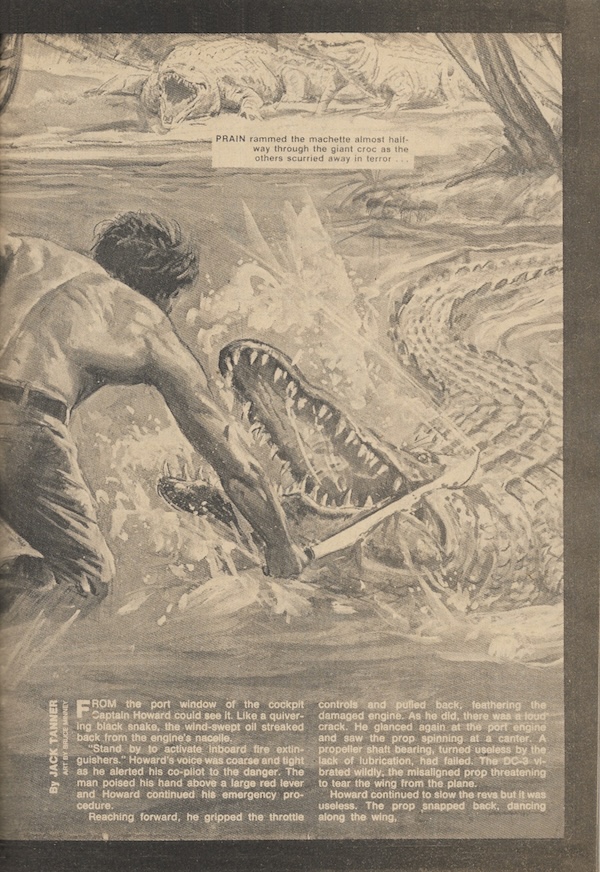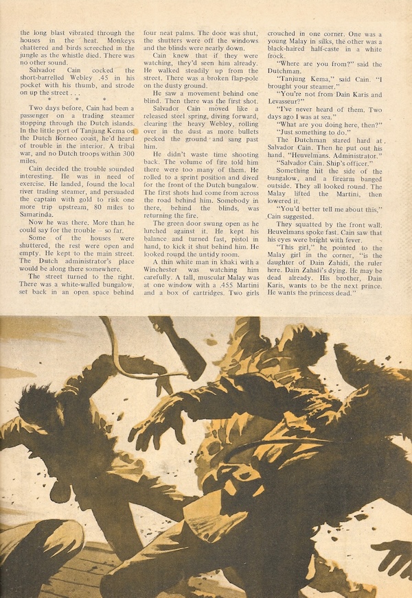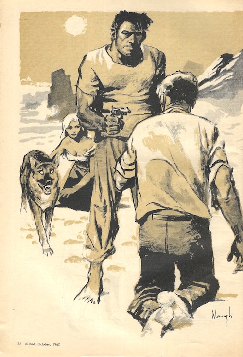 And of course there’s art. Jack Waugh, as always, makes his presence felt, and Earl Norem makes a surprise appearance. We thought his work appeared only in U.S. men’s adventure magazines, so our first thought was: Good on him for making it Down Under—hope he got well paid. Then we had a closer look. His art for the story “Escape Ring” looks far less crisp than the other illustrations. His signature is fuzzy. We think Adam borrowed the art from another magazine. Don’t quote on us that. Dirty Aussie thieves! Don’t quote us on that either. Forty-plus art panels below.