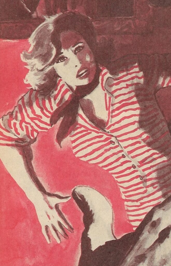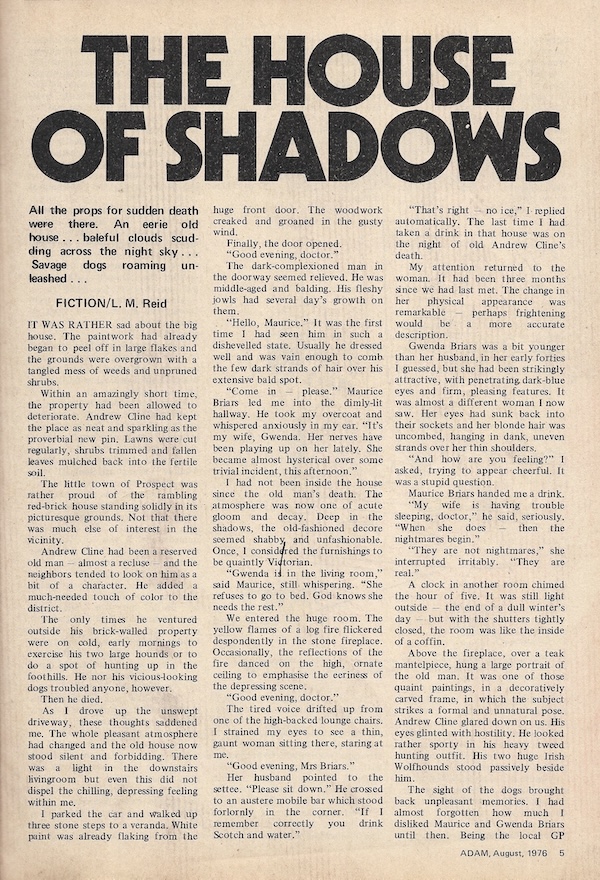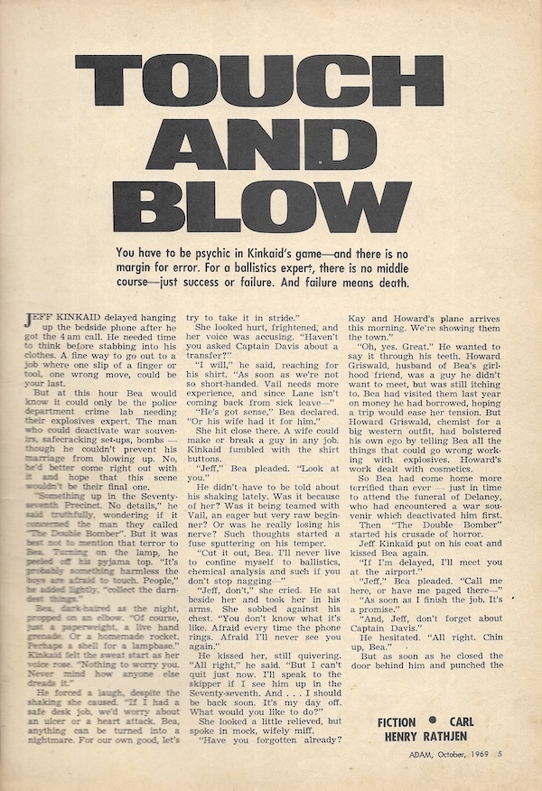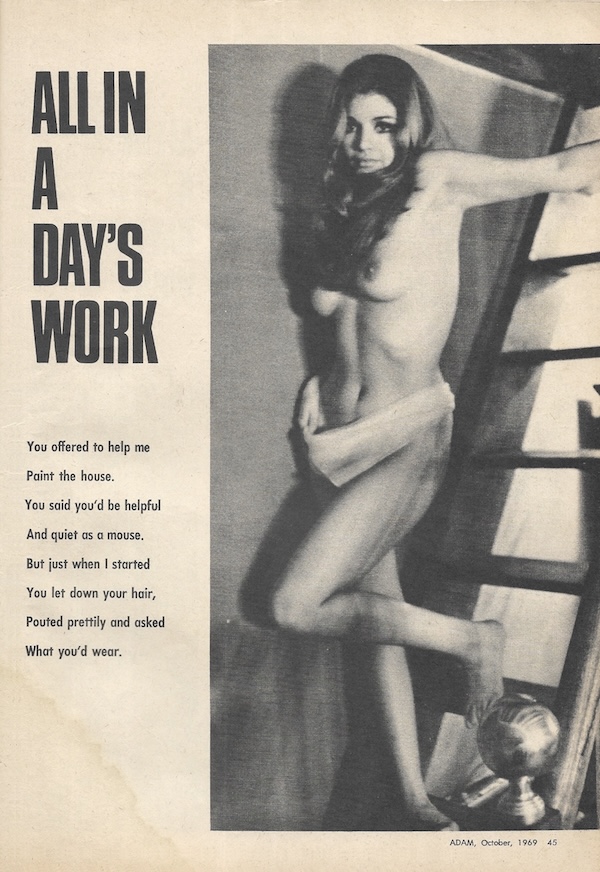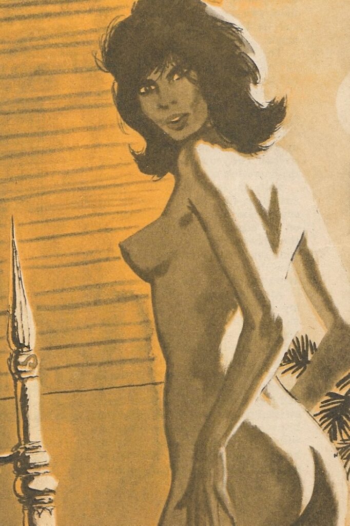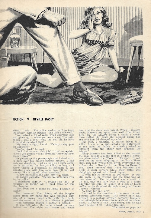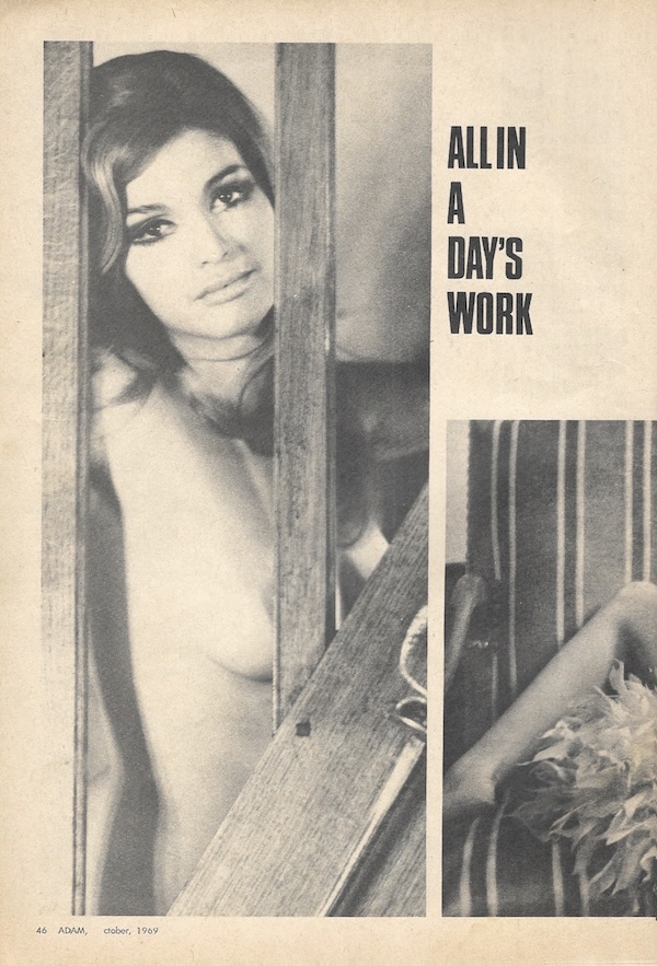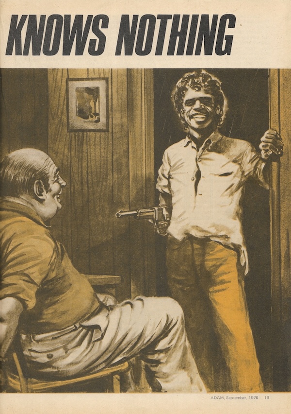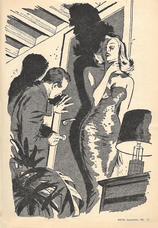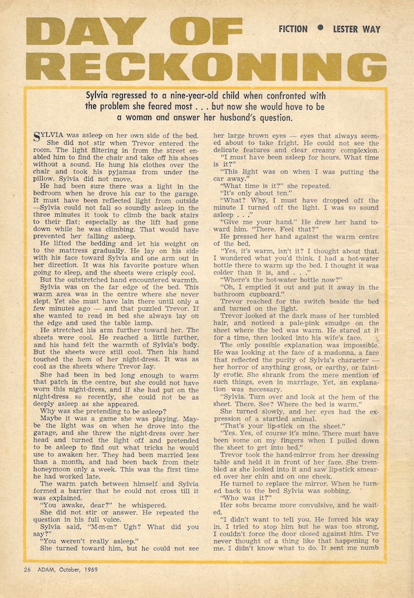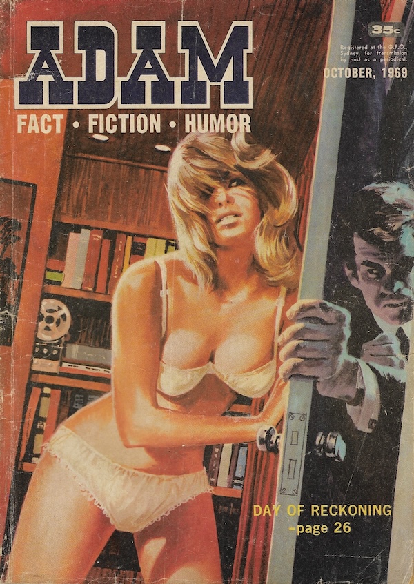 Straight outta Sydney we have an October 1969 issue of Adam for you today. The cover illustrates Lester Way’s story “Day of Reckoning,” in which a man learns that his wife is a liar and cheater, but only after the cops tear apart her story of a rapist home invader. It’s a good little tale, but you can’t help noting the cops’ immediate disbelief. Way unwittingly reflects policing culture around sexual crimes at that time (and often this time too). Or at least, we assume it was unwitting. Maybe he’s a cleverer writer than we think. But since the attack never happened, the cover art represents the wife’s fabrication to the police and her husband.