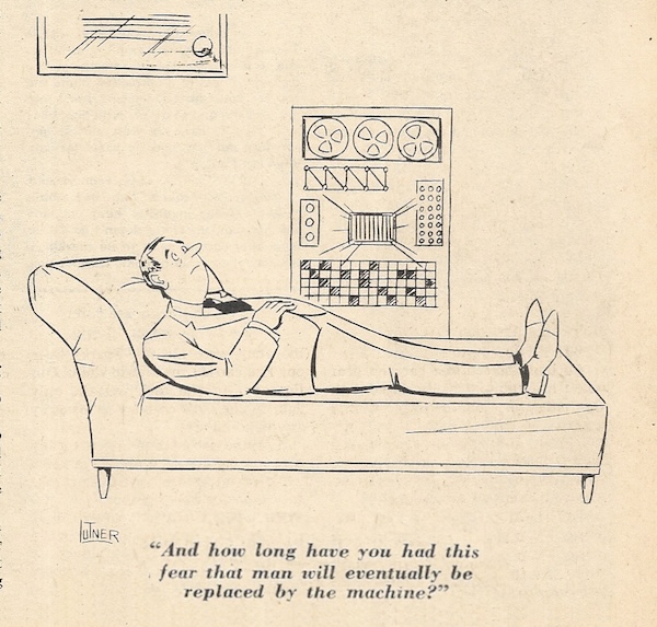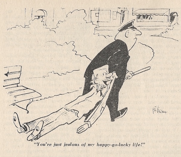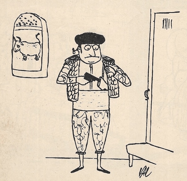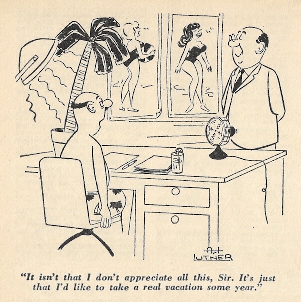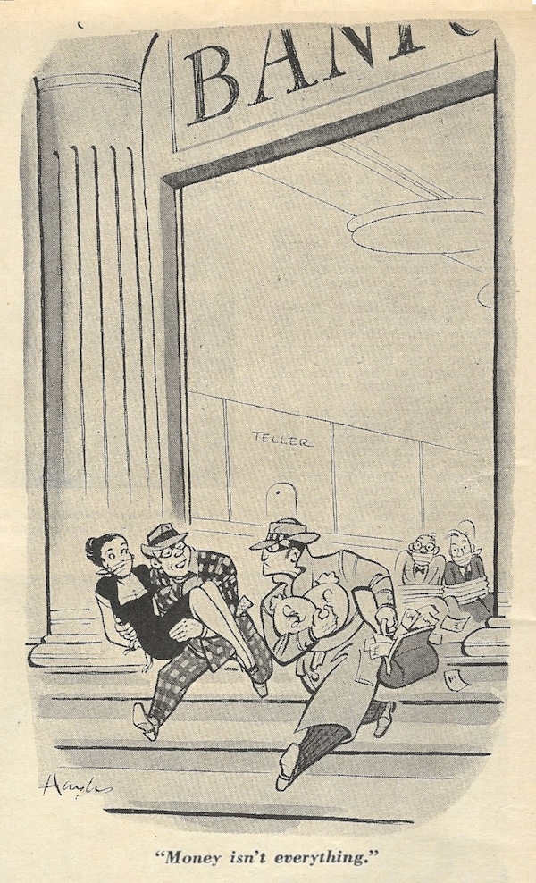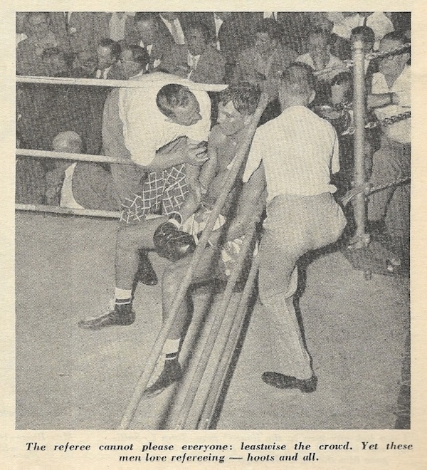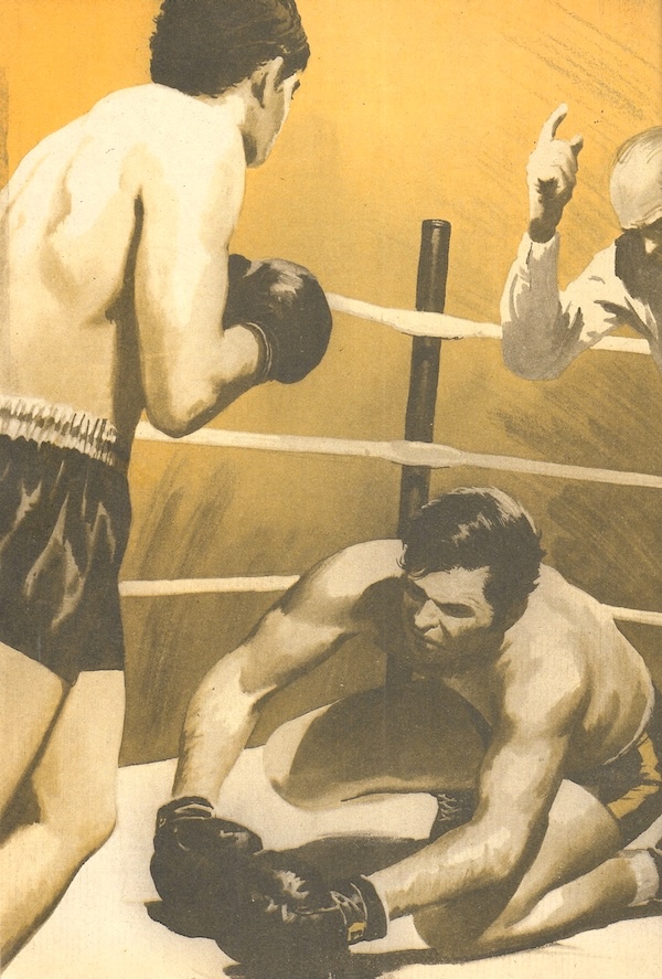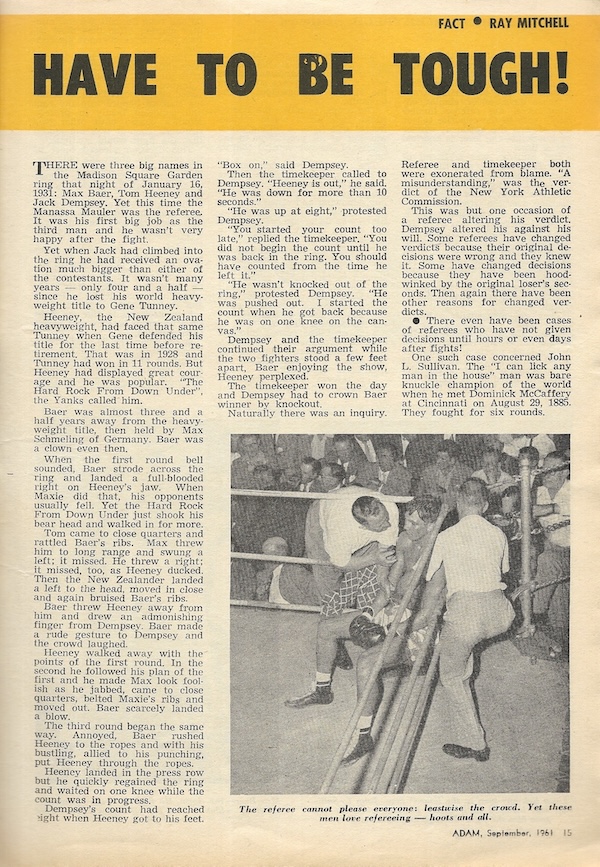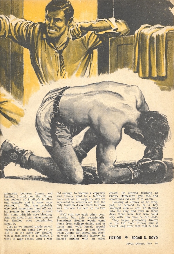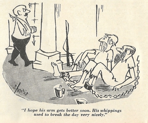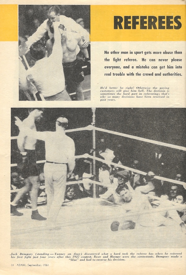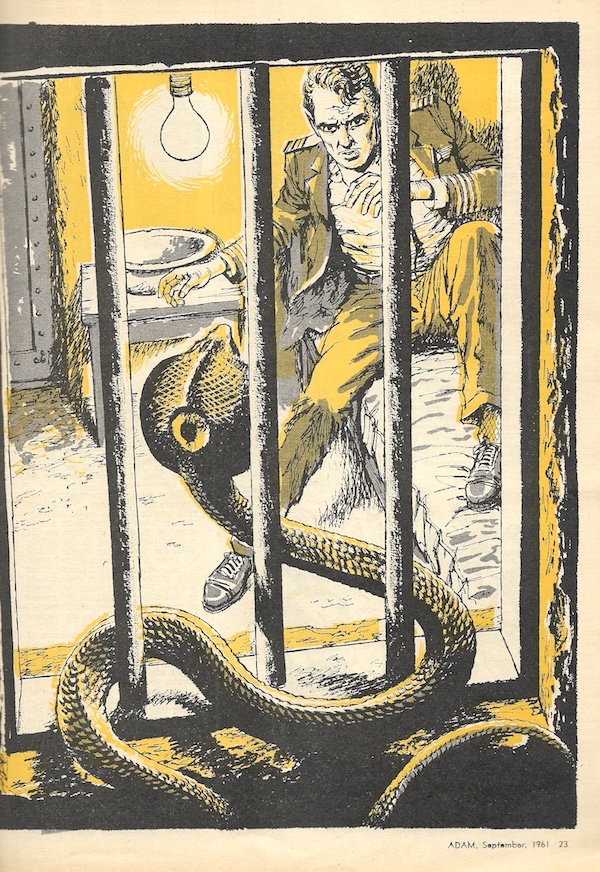 Elsewhere in Adam the editors devote several pages to international boxing, and specifically the idea that referees need to be tough. We’ll agree with that—we’ve seen a couple get slugged in the face. The article gives numerous examples of problematic situations for refs, and mentions that in the U.S. the Ku Klux Klan had a part in fixing fights so white boxers would win. In addition, in panel eleven you saw a typical theme in mid-century cartoons—two men in a dungeon. We put together a collection of those a while back which you can see here. We still have issues of Adam coming in on occasion, so right now we have more than thirty to post. Look for more soon.