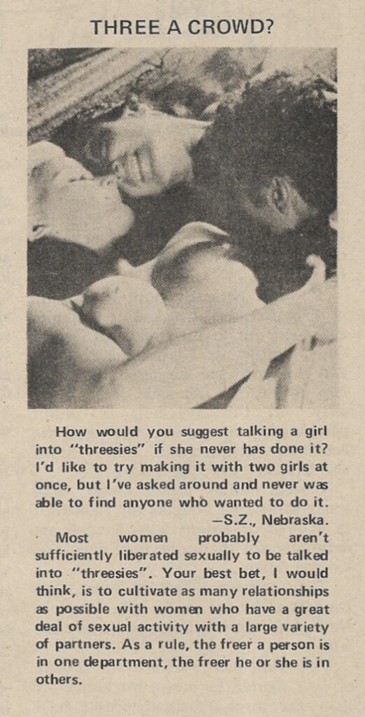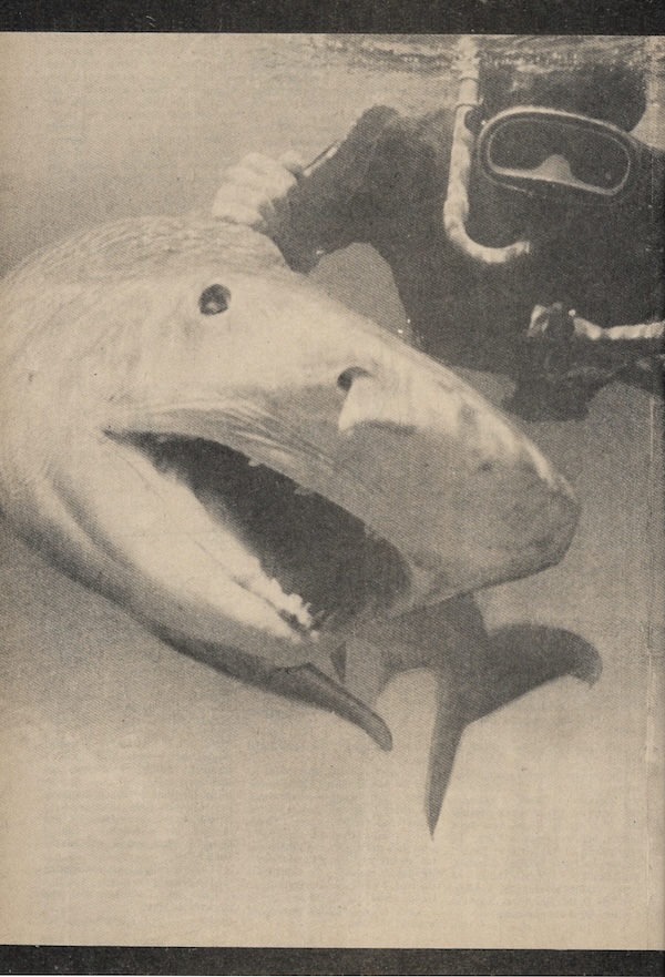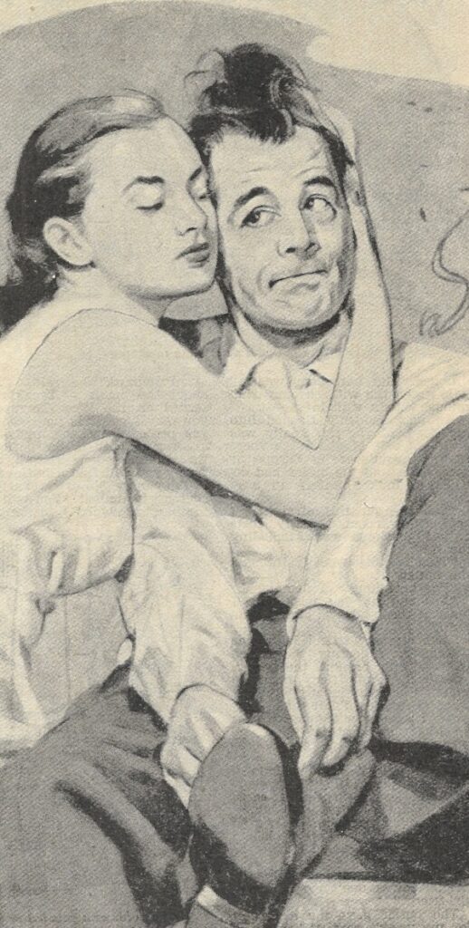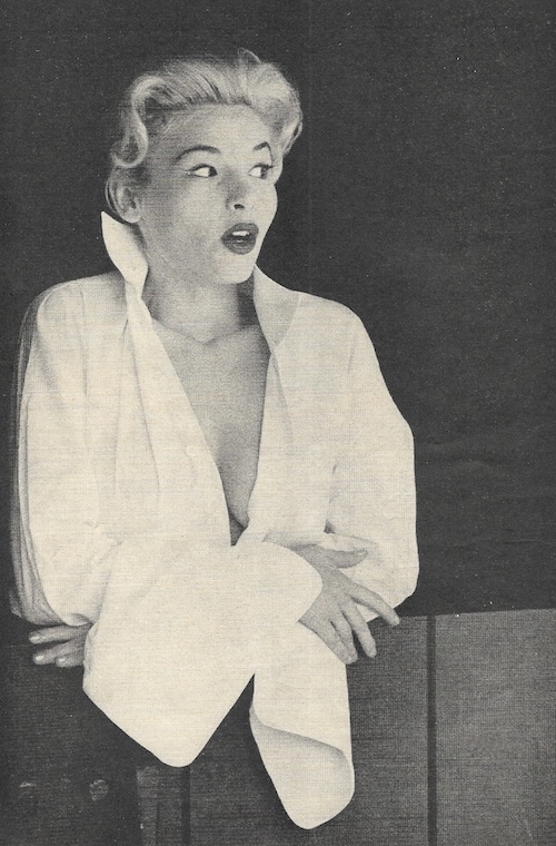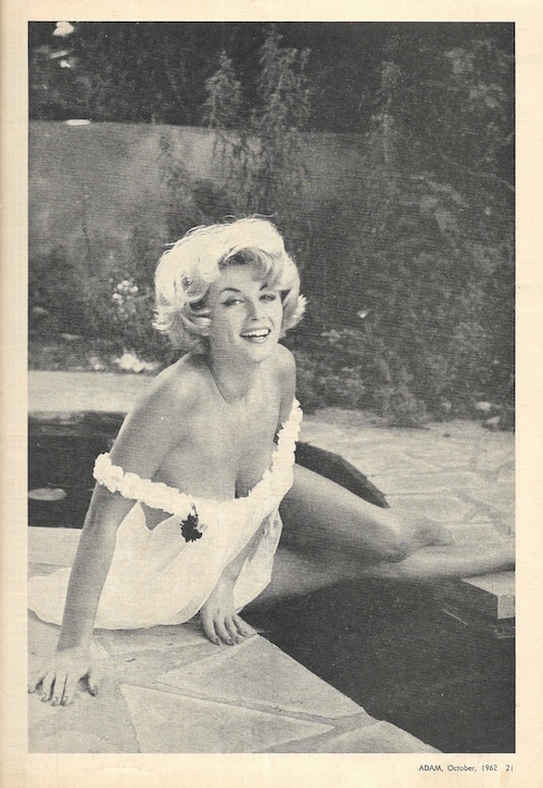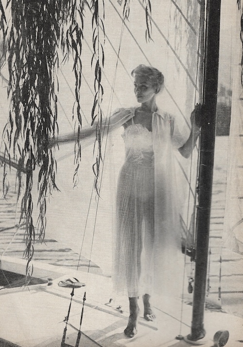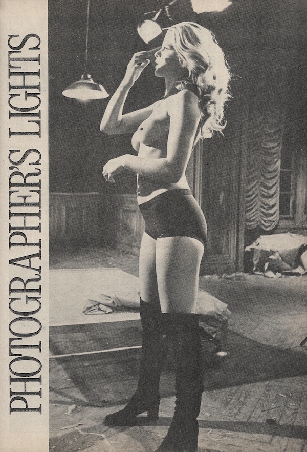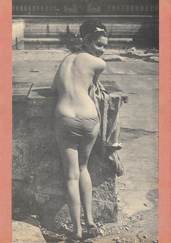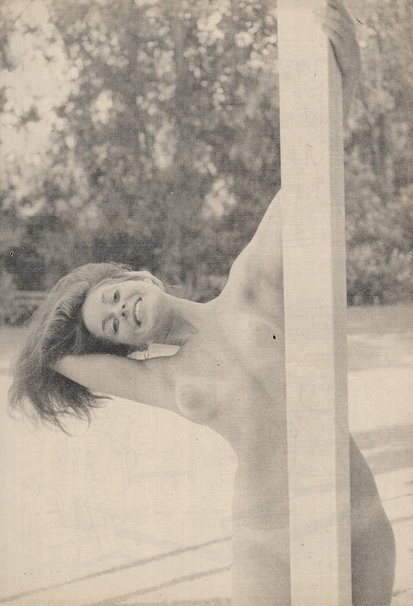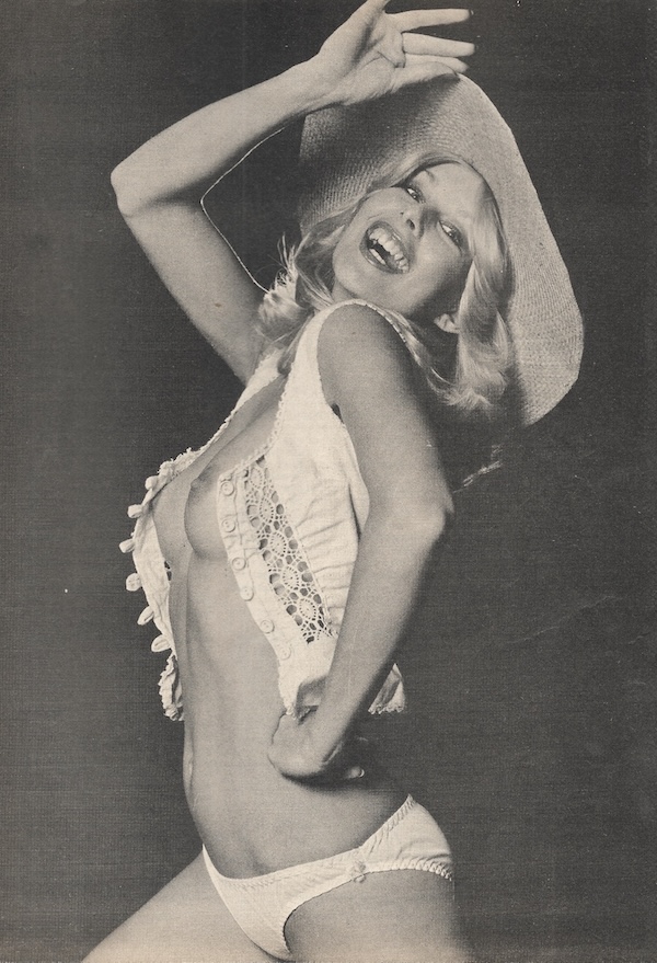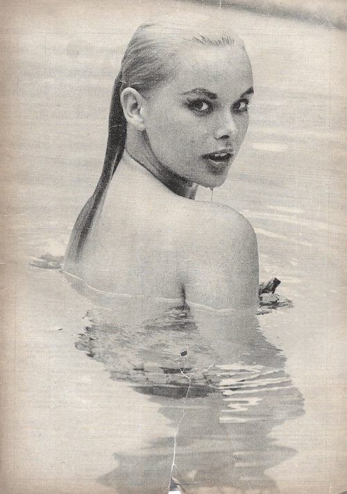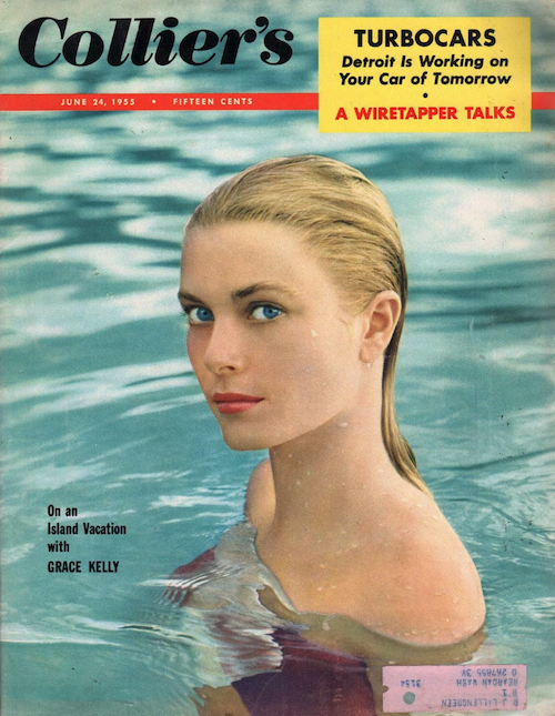 In terms of art and photography there’s less than in later issues, especially those from the mid-seventies and onward. You get a mere five model pages. The inside back cover features one with slicked back hair in a pool. Whoever photographed her may have been in love with Grace Kelly. He posed his blonde exactly the way Howell Conant famously posed Kelly in Jamaica in 1955 for a cover of Collier’s magazine. We’ve added an inset of that shot.