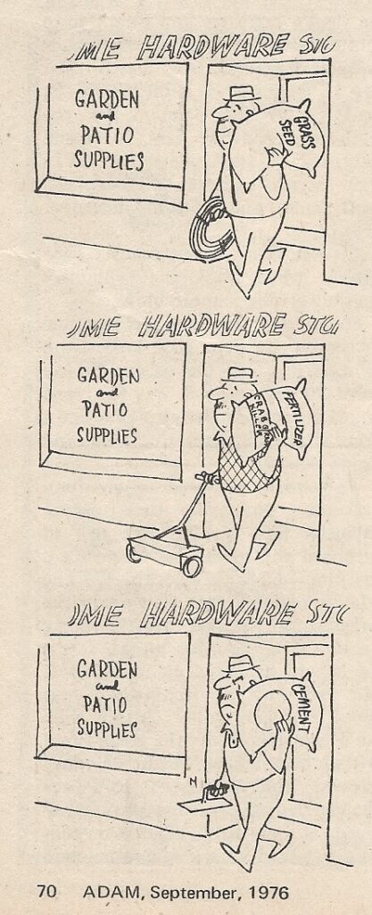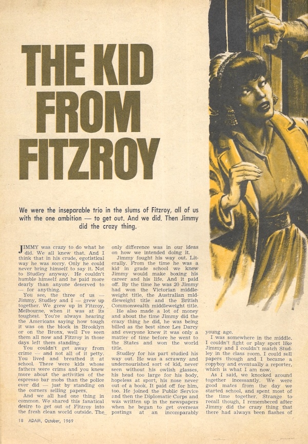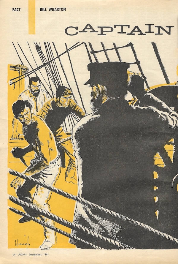 The above issue of Adam magazine was published this month in 1961, with a cover illustrating Arne Paule’s story “Dead on Time,” about a gangster who hires out the killing of his mistress, which of course doesn’t happen once the killer gets a look at the target. As usual there’s art signed by Jack Waugh inside, while another illustration—the one split into panels five and six—is signed by Yaroslav Horak. Sometimes known as Larry Horak, he was a Czech-Russian born in China who emigrated to Australia in childhood, began working for Adam‘s parent company K.G. Murray Publishing in 1957, and put together a career that made him one of the most prolific cartoonists in Australia.