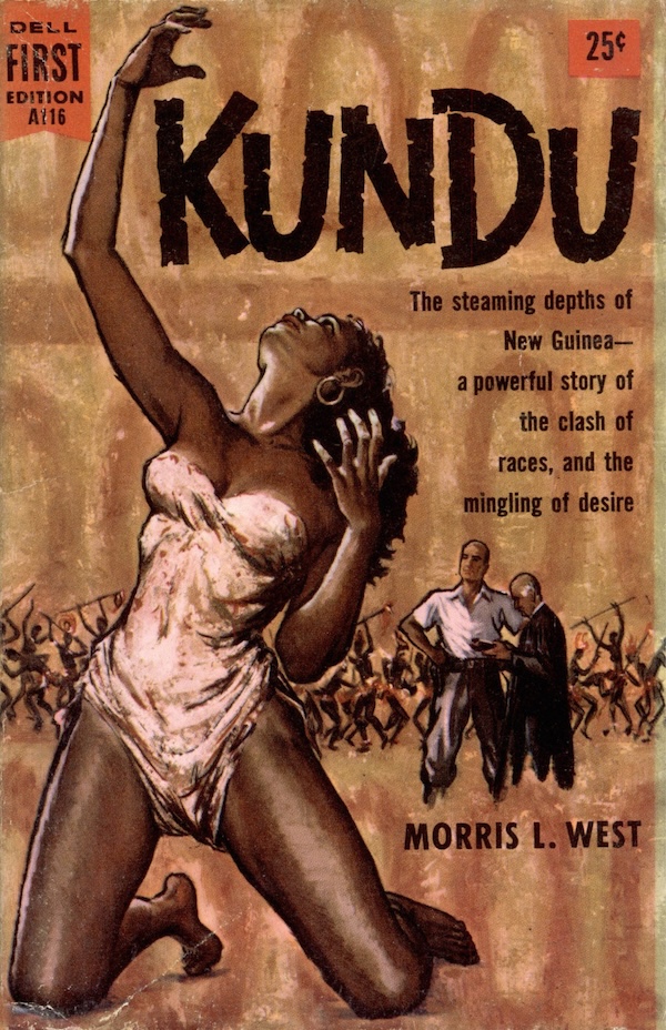 Australian author Morris L. West’s novel Kundu has been reprinted many times, which is often (though not always) an indicator of quality. We’ve seen editions from HarperCollins, Panther, Bantam, Ulverscroft, Allen & Unwin, Granada, White Lion, and Mayflower, and those are just the English editions. But he first published it in 1956 as the Dell paperback you see here with nice Victor Kalin art.