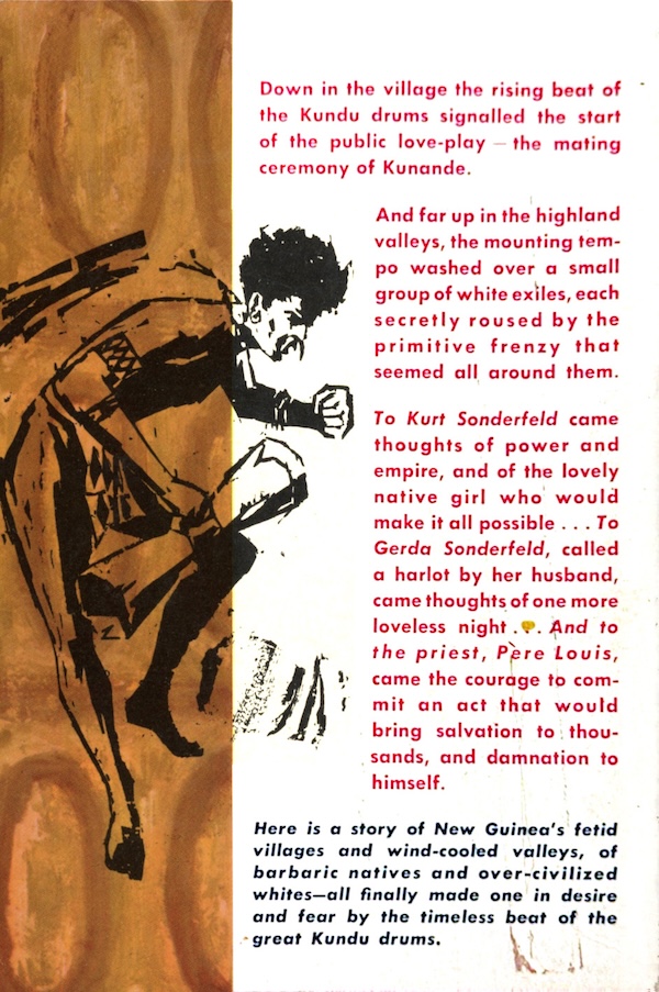 Between the covers West tells the story of a diverse group of colonials in the highlands of New Guinea, amongst them a priest, a district police officer, a “witch doctor,” a German farmer named Kurt Sonderfeld, and his wife Gerda. There are many unusual undercurrents among these people, not least the hate-hate relationship between the Sonderfelds, who openly cheat and can barely stand each other’s company.