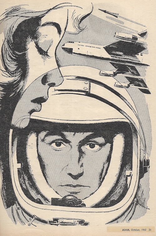 The cover of Adam magazine from this month in 1962 is simpler than normal but very effective too. Instead of the usual three figures, you get the lone woman with an explosion in the background. It pairs with Jay Edmond’s short story “The Deadly Angel,” about a test pilot’s wife whose husband dies in the fictional X-20 jet (modeled after jets like the Bell X-1 flown by Chuck Yeager). After her husband goes down in flames Lorrie Chambers takes up with another pilot, who also dies during a test flight. Then she takes up with another who dies, and another. Protagonist Len Jacobs meets her in a bar the night before his own X-20 test flight. Is Lorrie a jinx, or is she suffering a run of otherworldly bad luck? He’s advised not to go near her, but he can’t stay away because she’s beautiful—of course—and he can’t back out of the test. So the story concludes with his flight into the stratosphere. Does he survive? The cover tells you. We’ll just say the story was an interesting change from the tiger hunts and treacherous fatales you usually get in Adam.