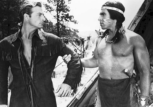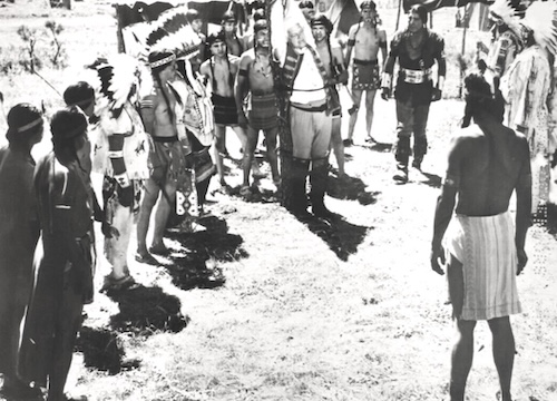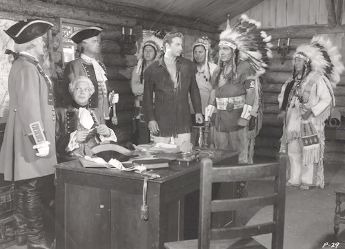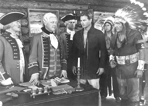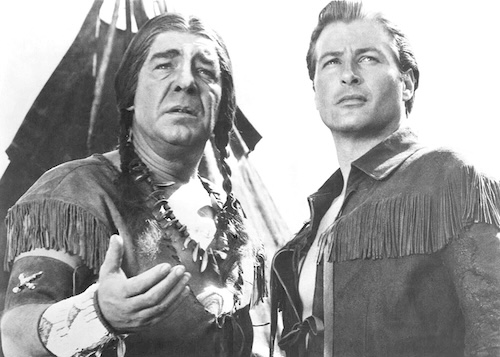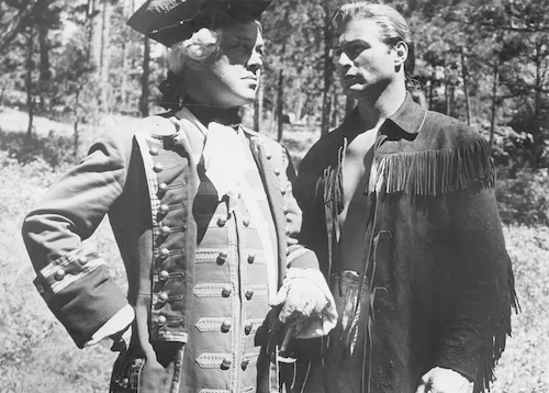 Throughout all the battles and betrayals hero Lex Barker—the only noble white character—speaks in a neutral American accent that didn’t exist 200 years ago, while the supporting white players do their best evil nazi and pompous Brit dialects. This is a nice little trick, portraying all the bad guys as essentially foreign. Never mind that the U.S. is made up of descendents of those colonists, and Barker’s character is a colonist too. In cinematic terms it’s a deft, almost subliminal job of blame shifting. That the film also showed overseas, where accents would have been lost on audiences, thus making it play more like a broad indictment of colonial expansionism, is an irony.