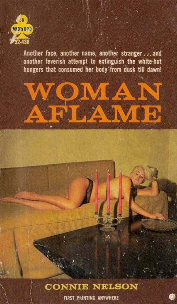 As you can probably tell from our recent book focus, over the holidays we went through a number of novels. Connie Nelson’s sleazer Woman Aflame, published by Midwood in 1965, is so rare we can’t even find mention of it online. It’s basically the anatomy of an extramarital affair, as self-sufficient career woman Sally Springer starts bedding down behind her husband’s back with a stranger named Victor. Most of the story deals with him, so a rear cover blurb mentioning a “parade of virile strangers,” is a bit misleading, but about three quarters of the way through she indeed moves on to another man named Tim, then one named—improbably—King. But Victor is never out of her life because he had an ulterior motive all along: he’s a pornographer and has been non-consensually filming himself with Sally. She’s trapped, and blackmailed into continuing. Nelson writes all this with some depth and introspection, though not necessarily great skill. In the end Woman Aflame isn’t bad, but it isn’t recommendable either. Next.