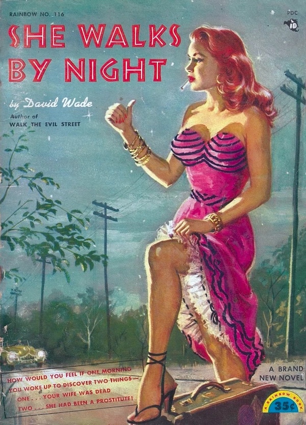 Above is a beautiful but uncredited cover for David Wade’s, aka Norman A. Daniels’, 1952 novel She Walks by Night. We can round up the usual suspects trying to guess who painted it—digest specialists Howell Dodd, Rudy Nappi, George Gross, et al—but we can prove nothing. It was probably painted by Dodd or Nappi, but that’s just our opinion. Other vintage book diggers have had years to ponder the question. If they don’t know who produced this piece, we can’t help. The art is surely a reason the book can be expensive, but luckily we didn’t pay much for it—which is good because we’ve found Daniels’ prose to be mediocre and didn’t want to go overboard.