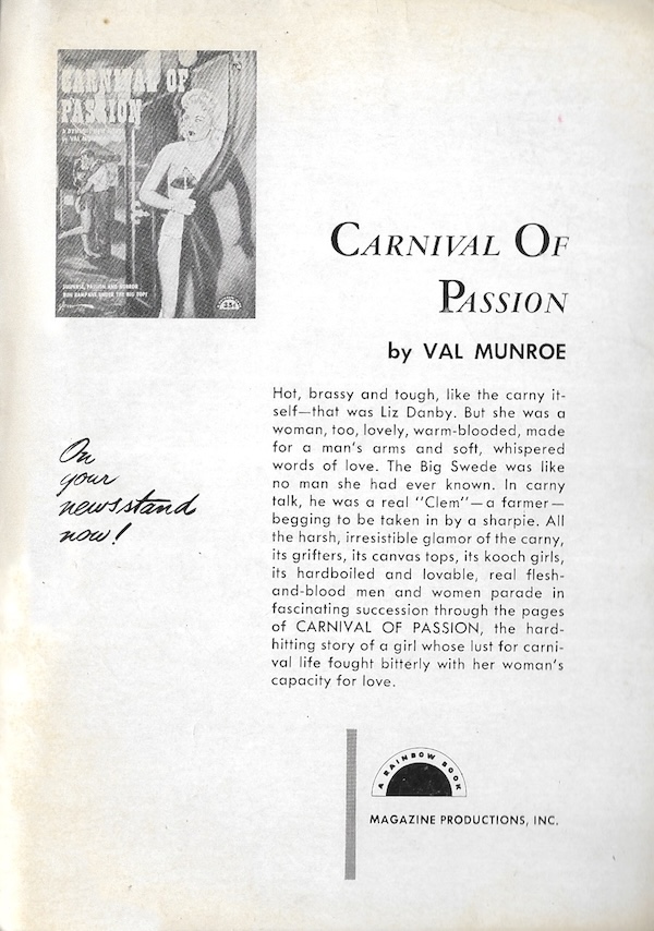 Daniels is no wizard of mystery construction. Webster handles the few suspects bull-in-china-shop style and narrows them down to the person who was the most obvious malefactor all along. We’re stopping with Daniels. Time and money are too precious to keep giving mediocre writers chances. But the cover art makes She Walks by Night a worthy library addition anyway. Sometimes digests have photo art in which models act out moments from the narrative. Here all you get is an ad page for Val Munroe’s Carnival of Passion, which happens to be one of the better ’50s digest novels we’ve read. Our advice: buy that one instead of this one.