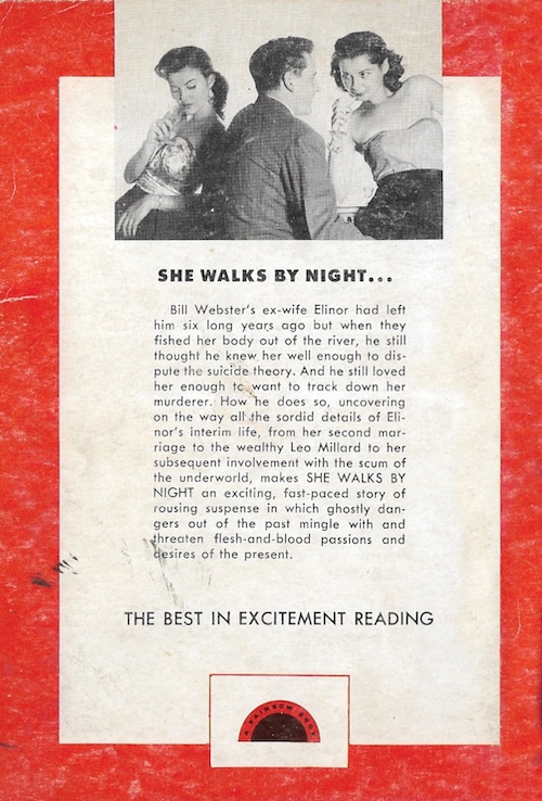 Usually digest novels are in the categories of romance and erotica, but Daniels published murder mysteries in this format. She Walks by Night is about a drugstore pharmacist named Bill Webster whose ex-wife Elinor turns up slain and dumped in a river. Webster gives the cops a hard time about finding the killer, and when dissatisfied with their response sets out to do it himself. He learns that after a bad second marriage and a run of bad luck his ex became a prostitute. He zeroes in on the family of her second husband, and a sweltering hothouse meeting with their corrupt patriarch that’s lifted whole from The Big Sleep cements his suspicions. But is he right?