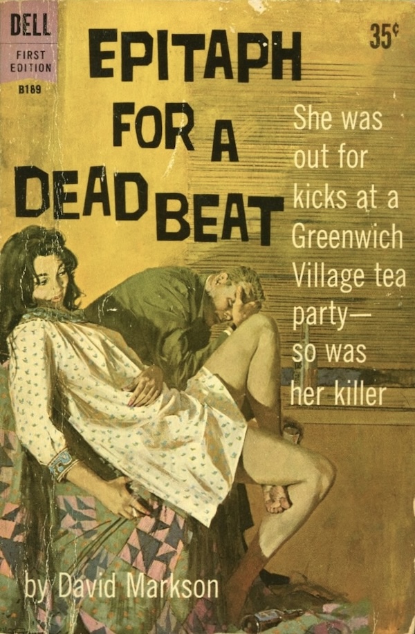 We meant to get back David Markson’s private dick Harry Fannin sooner than today, but you know how it goes. We finally read this 1961 Dell edition of Epitaph for a Dead Beat with Robert McGinnis cover art, in which Markson brings back the former college halfback turned private detective from 1959’s Epitaph for a Tramp. This time Fannin becomes involved in what seems to be a case of family members successively knocked off for a $13 million inheritance. He descends into New York City’s beat counterculture of writers, poets, and general seekers of thrills and enlightenment.