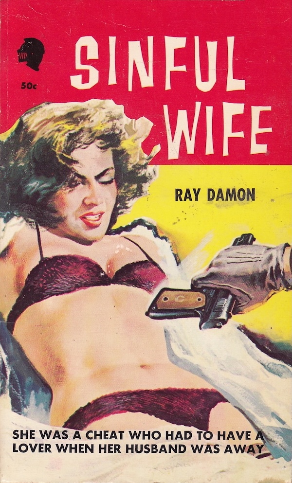 The cover of Ray Damon’s 1961 novel Sinful Wife is dynamic, but uncredited. We suspect it’s culled, like yesterday’s cover, from another piece, particularly because nothing like this pistol-whipping moment occurs in the book. There isn’t even a gun in the tale. But we can’t track down any clarifying info, so uncredited this artist shall remain. The novel is a Double Indemnity scenario in which a door-to-door salesman gets involved with a supposedly lonely wife, and is enticed to knock off her husband—literally, with a hammer. Damon brings nothing innovative to the concept but writes competently, and we liked that the main character Joe Lang is an inexperienced guy who’s never been loved, or even properly laid. He knows he’s risking the death chair but feels that his life without femme fatale Stella Norwood would be worse than dying. The moron. There’s minimalist characterization within a constrained narrative, and it works. The book is an improvement over Damon’s 1959 novel Broadway Bait, so it’s also a nice example of authorial growth. We’d read him again if we came across another book on sale cheap. That’s a sound endorsement.