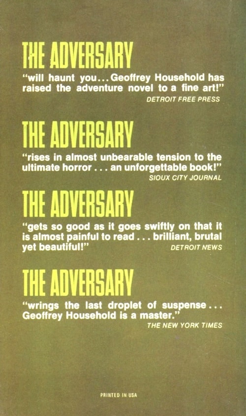 As we’ve said before, we rarely read reviews before buying books (as if you couldn’t tell from some of the lemons we pick up) because we think they usually give away too many plot points. But we do sometimes unavoidably run across them. We saw a review of Geoffrey Household’s 1964 novel Arabesque that was so rapturous we took to the auction sites. How could we not read this guy? We found a pair of Households, of which we considered The Adversary the throw-in, the one you must buy to get the other. We placed him in line behind books we already planned to read, and later when his turn came mistakenly thought it was The Adversary we were eagerly anticipating instead of Arabesque. The eye-catching cover art you see above (uncredited) probably had something to do with the error. So into The Adversary we plunged, and if Arabesque is a better book we’ll be surprised.