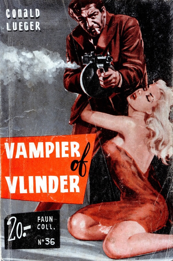 Above: an unknown artist’s work fronts 1960’s Vampier of Vlinder by Conald Lueger, from Antwerp based Uitgeverij A.B.C., part of its Faun collection. Many of the company’s covers were borrowed wholly or in part from U.S. paperbacks, but if so in this case, we don’t know which book it was. Lueger, or Leüger, as he’s sometimes credited, authored numerous mysteries for Dutch and Belgian publishers, but little seems to be known about him. You can see a bit more of his output by clicking his keywords below.