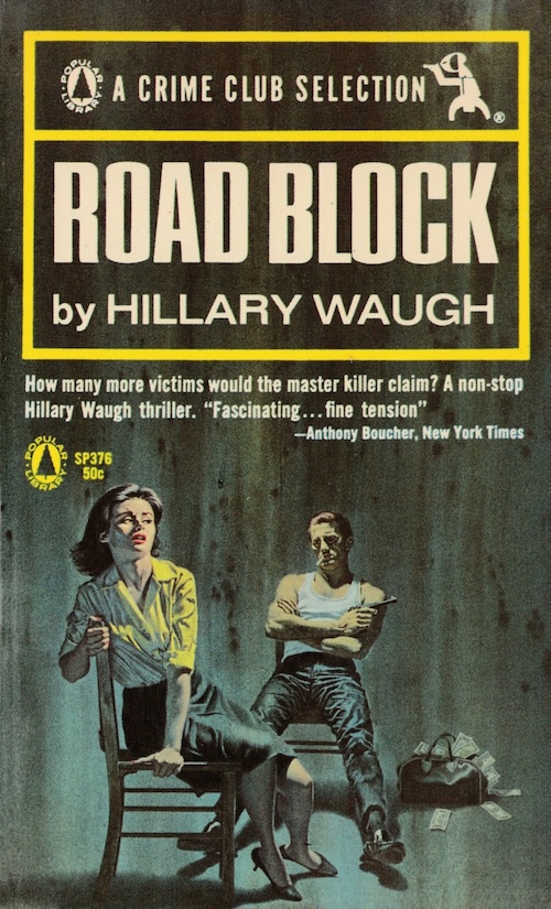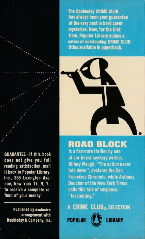 Hillary Waugh wrote the procedural crime thriller Road Block in 1960. This Popular Library edition came in 1965 with great cover work by an unattributed artist, and a cool rear logo for the Crime Club collection. Doubleday & Company launched Crime Club in 1928 and it ran until 1991, at least part of the time in collaboration with Popular Library it seems, and more than 2,400 books ended up in the grouping. Along the way there were some spectacular covers, particularly during the ’60s, such as today’s. We’ll be seeing more from Crime Club in a bit.