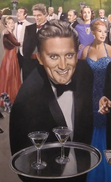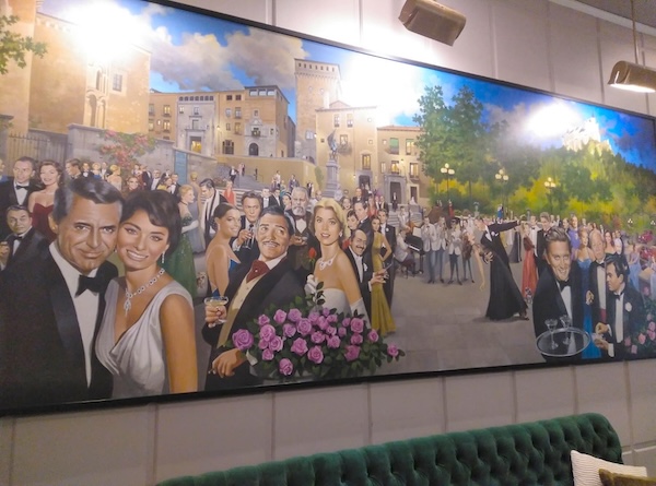 We texted the girls back and amazed them (and the staffer) by naming everyone in the mural that we could discern based on the available resolution. Among them are Cary Grant, Sophia Loren, Clark Gable, Grace Kelly, Kirk Douglas, Edward G. Robinson, Romy Schneider, Orson Welles, Fred Astaire, Louis Armstrong, and many others. The only faces we weren’t sure about are definitely European stars. Since there’s no list anywhere of who’s in the mural, we’ll never be able to check our guesses on those.