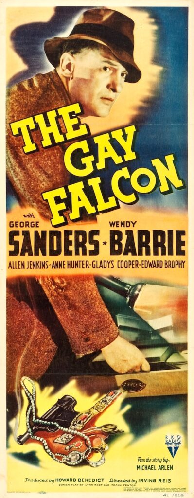 It’s probably impossible to run out of beautiful promo posters for old movies. This was made for The Gay Falcon, which hit cinemas today in 1941. The lead character, a nationally famous sleuth, is named Gay Laurence, so that’s the front part of the title. Nothing to do with either gay or happy. The back part derives from the source material, in which author Michael Arlen gave his creation the name Gay Falcon. Why RKO Radio Pictures changed it for its adaptation we can’t say, especially since the name lives on in the film as a moniker, but okay, Gay Laurence it is.