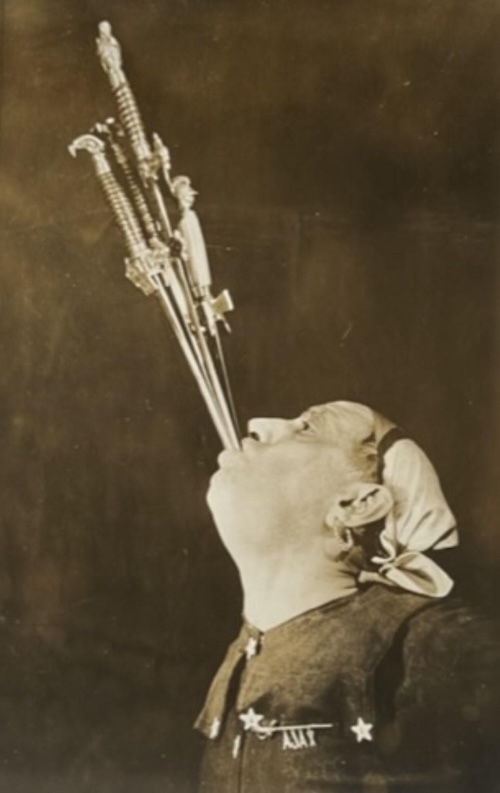 Sometime in 1928 while in New York City, according to the info on the negative, he made time to pose for the above scan at the behest of photographer Edward J. Kelty, who took credit for the image. In case you doubt the veracity of the shot, we can tell you the original sold at auction some years back for big dollars. In the inset photo you see Ajax necking an entire set of swords. That’s just pure talent. PSGP once got conned into a banana eating contest and came in last place, so he really appreciates what this guy brought to the table. You should too, so if you want to see Ajax in action there’s a YouTube video here, while it lasts.