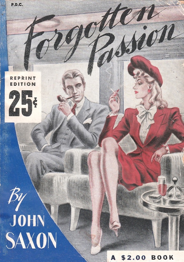 This uncredited cover was painted for the digest novel Forgotten Passion by John Saxon, from Knickerbocker Books in 1946. Saxon was in reality James Noble Gifford, a prolific author who produced Army Widow, Pleasure Girl, Passionate Tigress, aka The Tigress, A Touch of Passion, Summer Interlude, Love Laughs Gaily, and many other efforts that all sound pretty fun. We’ll run across him again, we’re sure.
