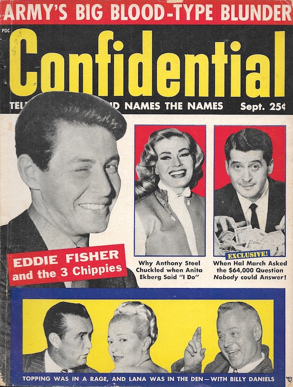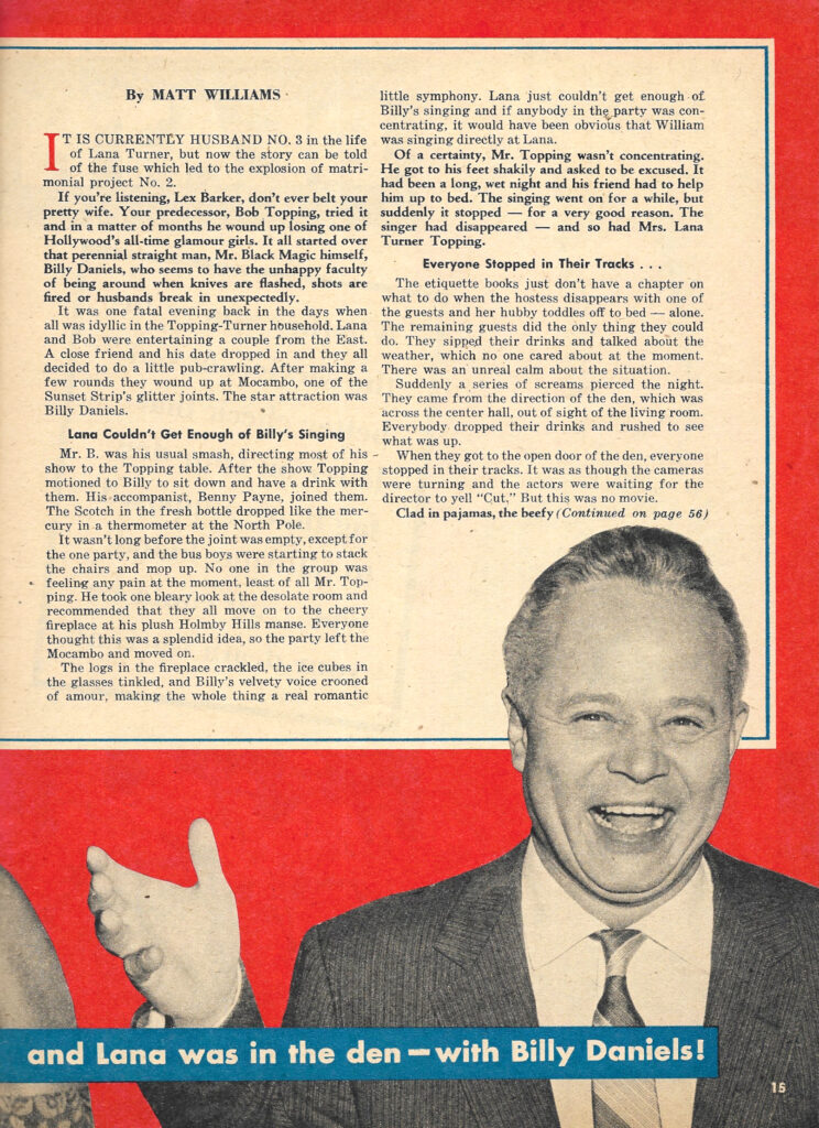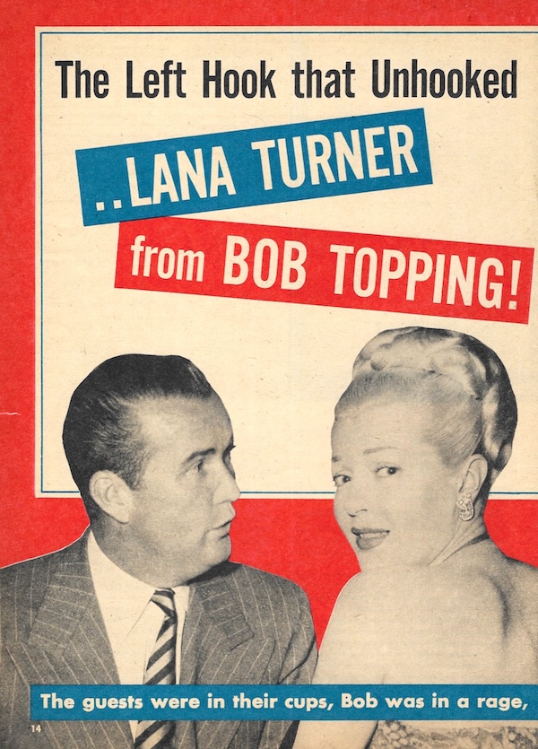 Confidential next tells readers that Bob Topping, aka Henry J. Topping, Jr., punched his wife—none other than Lana Turner—after she returned from having disappeared with singer Billy Daniels during a social gathering: Topping stood in a towering rage. He hit Lana with a left hook that caught her on the chin and knocked her across the room and onto a couch.