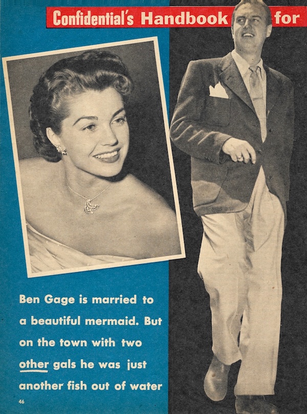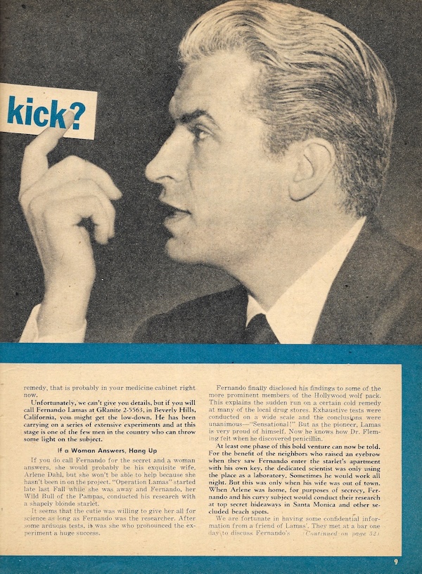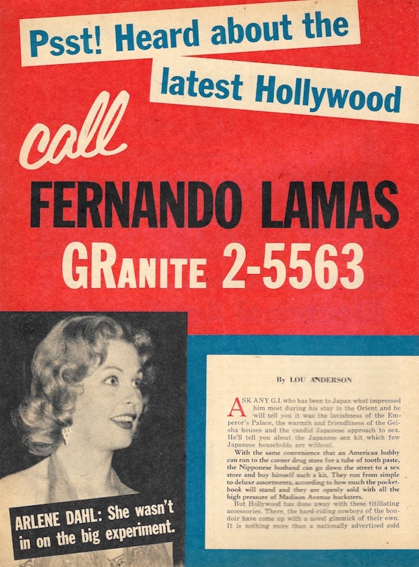Editors accuse Fernando Lamas of cheating on his wife Arlene Dahl, as well as popularizing the use among Hollywood insiders of a “drug store cold remedy” in sexual practices. The only thing the magazine won’t reveal is which cold remedy. But we figure it was Vicks VapoRub, which some people believed aided in erections. To give you a sense of how sneakily subversive Confidential was, consider the hint readers are given in the form of the alleged telephone exchange “granite.” That’s clever.