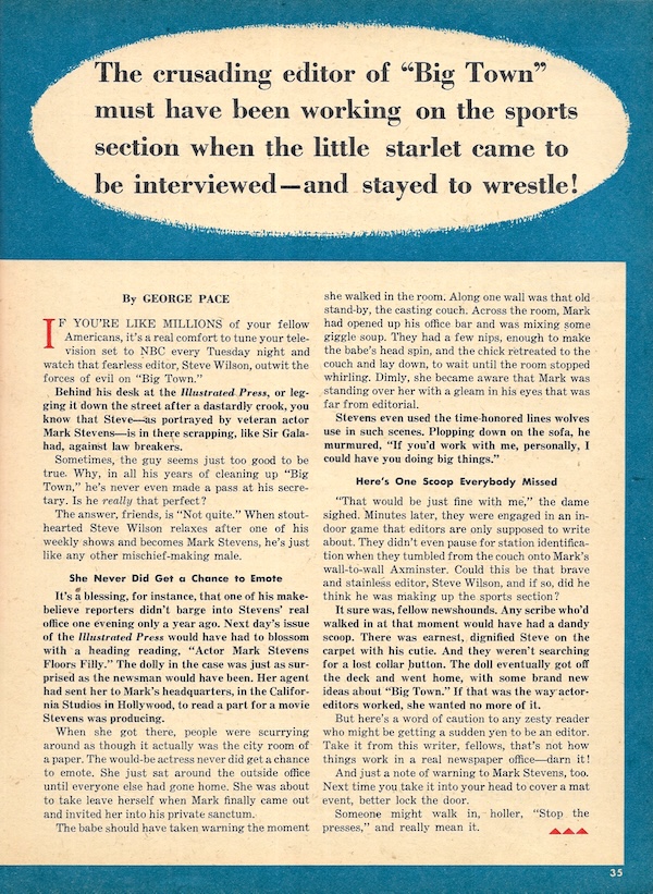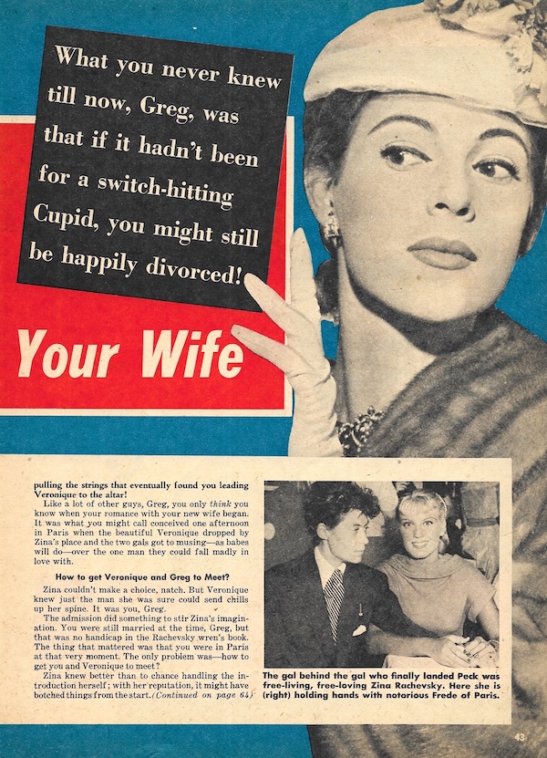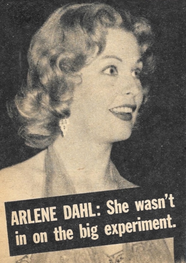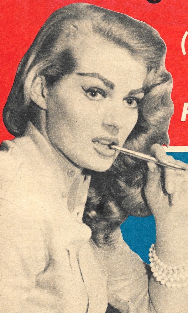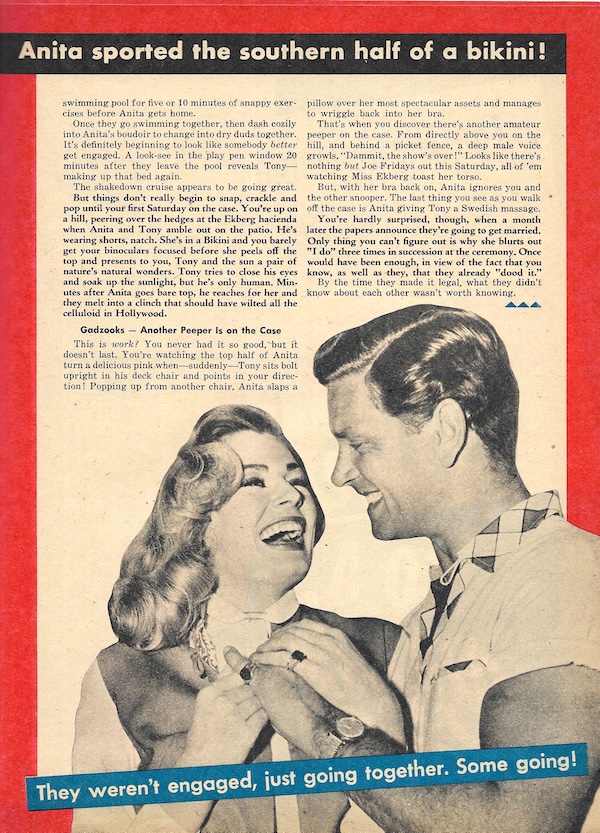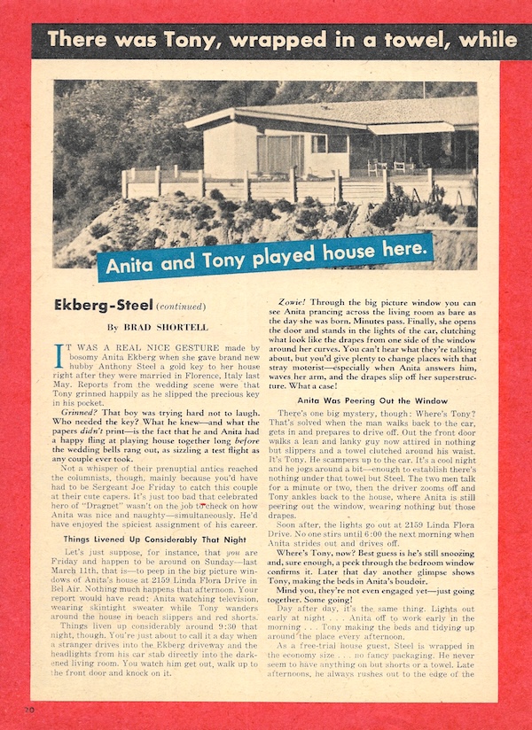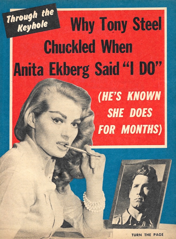 Readers learn that Anita Ekberg’s marriage to Tony Steel was more of a formality than anything else—the two had been shacking up for months before the wedding: As sizzling a test flight as any couple ever took. By the time they made it legal what they didn’t know about each other wasn’t worth knowing.